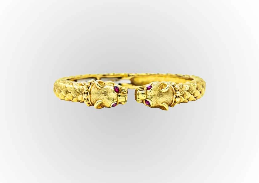 DescriptionThis 21st-century cuff bracelet features two stylized panther heads with texturous scales, gold bead collars, snarling faces, and textured fur. Each head has 2.5 mm round ruby cabochon eyes and medium red rubies. The bracelet opens on a hinge and weighs 55.8 grams. It's signed David Webb and comes from the Kingdom Collection. |