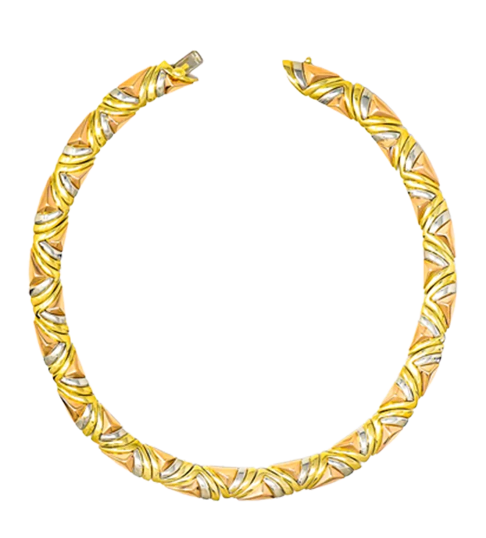 DescriptionIntroducing the exquisite FRENCH 1980'S 18 KARAT TRI-GOLD GEOMETRIC VINTAGE COLLAR NECKLACE, a true testament to timeless elegance and sophistication. This meticulously crafted collar necklace is a harmonious blend of fitted forms in tri-gold, designed to captivate and enchant. The Rose gold forms take the shape of dimensional faceted pyramids, adding a touch of allure and depth to the necklace. These intricately designed pyramids reflect light beautifully, creating a mesmerizing play of shadows and highlights. The Yellow gold forms, on the other hand, gracefully sweep across the necklace in the form of chevrons. These sweeping lines evoke a sense of movement and grace, enhancing the necklace's overall aesthetic appeal. To further enhance its allure, the White gold forms delicately curve along the necklace, serving as elegant accents. These curved accents add a touch of sophistication and refinement to the overall design. With a high polished finish, this necklace exudes a radiant glow, ensuring that it catches the light from every angle. Its lustrous shine adds a luxurious touch, making it a truly remarkable piece of jewelry. Completing this masterpiece is a concealed clasp closure, ensuring a secure and seamless fit. The French hallmarks for 18 karat gold are stamped onto the necklace, guaranteeing its authenticity and quality. Additionally, it is numbered and fully signed for Bvlgari, a renowned name in the world of luxury jewelry. Dating back to the 1980s, this vintage collar necklace carries with it a sense of history and nostalgia. Its timeless design transcends trends and fads, making it a valuable addition to any jewelry collection. Measuring at a width of 1/2 inch at its widest point and a length of 15 inches, this necklace is designed to sit elegantly on the collarbone, accentuating the wearer's neckline with grace and poise. With a total weight of 150.0 grams, this necklace exudes a sense of substance and quality. Its weight adds to its luxurious feel, making it a statement piece that is sure to turn heads. Indulge in the allure of the FRENCH 1980'S 18 KARAT TRI-GOLD GEOMETRIC VINTAGE COLLAR NECKLACE, a true testament to the artistry and craftsmanship of a bygone era. Embrace the elegance and sophistication it exudes, and let it become a cherished part of your jewelry collection. |