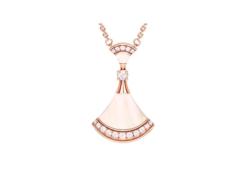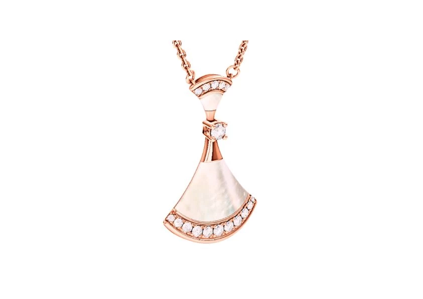 Crafted with utmost precision, the DIVAS' DREAM necklace is a stunning combination of 18 kt rose gold, mother of pearl inserts, and a mesmerizing round brilliant-cut diamond. The pavé diamonds further enhance its luxurious appeal, adding a touch of opulence and glamour to any ensemble.