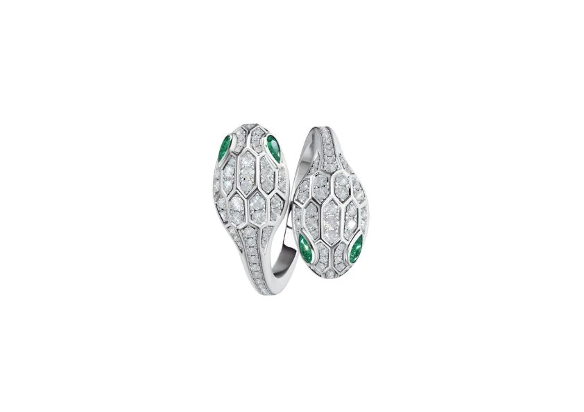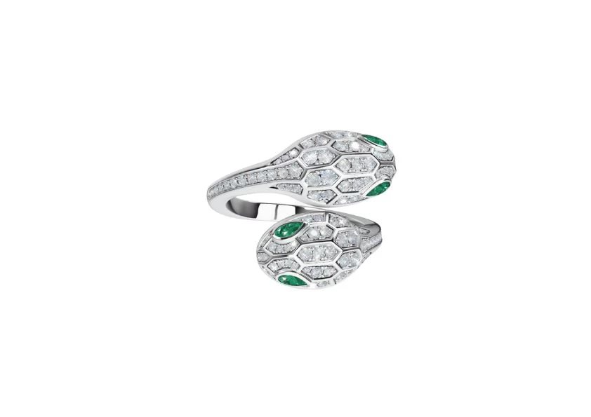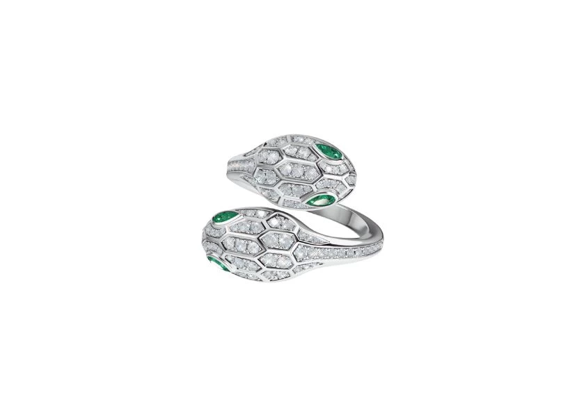 DescriptionIntroducing the Preloved: Serpenti Seduttori 18 kt white gold double head ring set with emerald eyes and pavé diamond. Prepare to be captivated by the alluring beauty of this mesmerising serpent-inspired piece. |