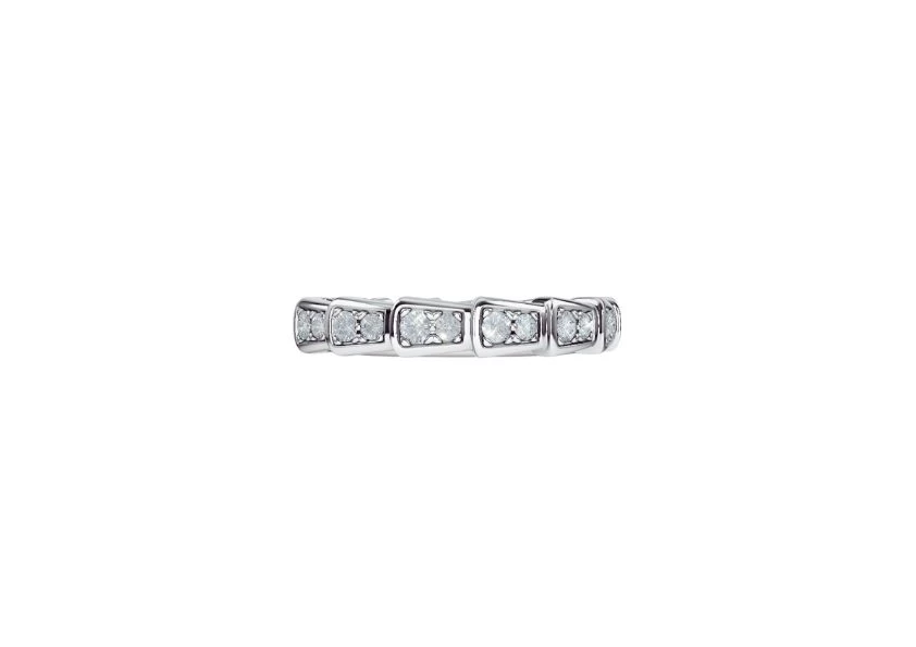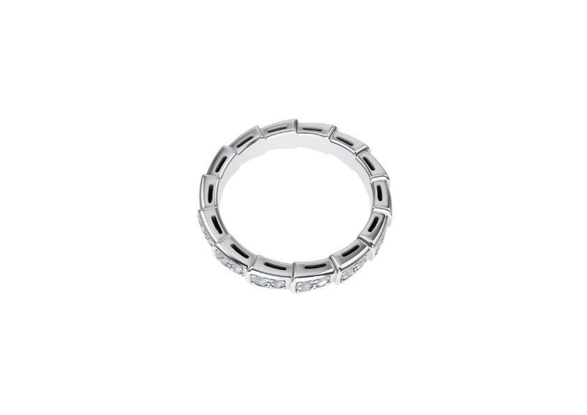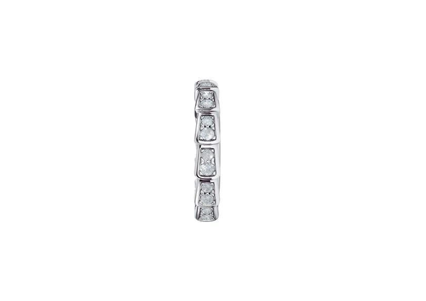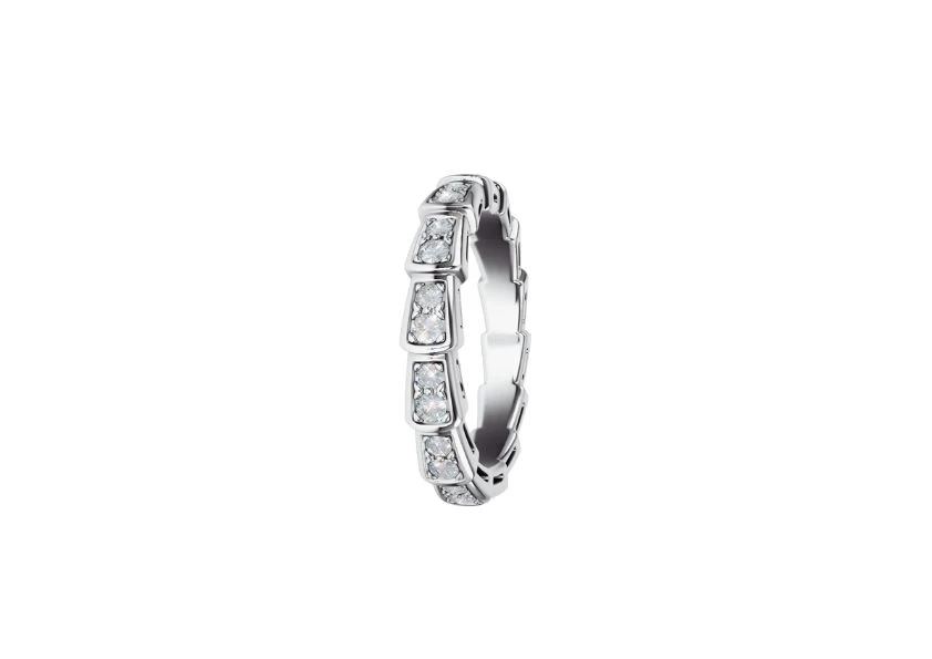 DescriptionIntroducing the exquisite Preloved: Serpenti Viper wedding band in 18 kt white gold, adorned with a mesmerizing display of full pavé diamonds. As an homage to its spirit animal, Bulgari has masterfully captured the allure of seduction within this remarkable piece. |