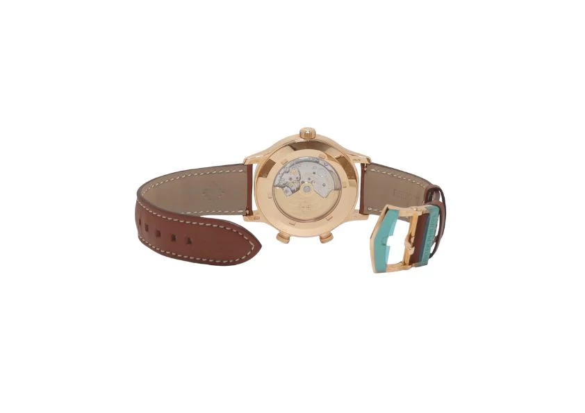 DescriptionIntroducing the Patek Philippe Complications 5524R-001, a truly remarkable timepiece that combines the timeless elegance of the Calatrava line with practical features that elevate it to new heights. Released in 2015, this Pilot Travel Time watch pays homage to the simplicity of the Calatrava while offering a range of functionalities that go beyond its traditional dress watch origins. Encased in stunning rose gold, the dial of this timepiece is nothing short of mesmerizing. With its captivating black-brown gradient, it exudes an air of sophistication and refinement. The gold applied Arabic numerals, enhanced with luminescent coating, ensure excellent legibility in any lighting condition. At 6 o'clock, a sub-dial elegantly displays the date, while a skeletonized second hour hand provides a second time zone. To further enhance usability, day and night indicators for each zone are also included. Powering this exceptional watch is the Caliber 324 S C FUS, an automatic movement with a 18k gold rotor that can be admired through the transparent caseback. This reliable and precise movement ensures accurate timekeeping and adds to the overall allure of the timepiece. Rest assured, this Patek Philippe has undergone a meticulous inspection to guarantee its water resistance, accuracy, functionality, and condition. We have also verified its authenticity and clean history through technical documents and manufacturer records. To provide you with peace of mind, this watch comes with a 24-month warranty. In conclusion, the Patek Philippe Complications 5524R-001 is not just a watch, but a statement piece that combines utility, elegance, and durability. With its rich history and impeccable craftsmanship, Patek Philippe continues to deliver exceptional timepieces that stand the test of time. Elevate your style and make a lasting impression with this extraordinary watch from a revered brand. |