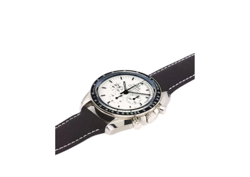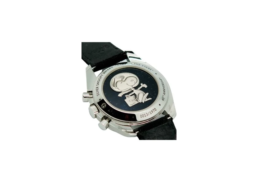 The design of this Moonwatch has been refreshed with a stunning white dial, adorned with a Super-LumiNova Snoopy on the 9 o'clock subdial. The dial proudly displays the iconic phrase "Failure is not an option" and poses the thought-provoking question, "What could you do in 14 seconds?" with 14 squares representing the beloved Snoopy comics. Crafted with meticulous attention to detail, the 42.00 mm polished-brushed case is made from stainless steel, exuding a timeless elegance. The polished black ceramic bezel ring, featuring Super-LumiNova on the tachymeter scale, adds a touch of sophistication to this exceptional timepiece. True to its heritage, this watch is powered by the renowned OMEGA Calibre 1861, ensuring precise and reliable timekeeping. The "Moonwatch" style hands pay homage to the original design, evoking a sense of nostalgia and authenticity. Completing the ensemble is a black coated nylon fabric strap, exuding a sense of ruggedness and durability. And as a symbol of distinction, each watch is accompanied by a meticulously crafted 925 Silver Snoopy medallion, adorned with dark blue enamel on the reverse.