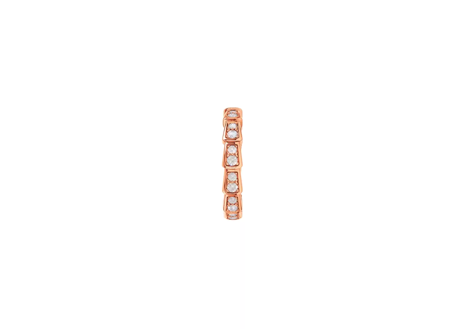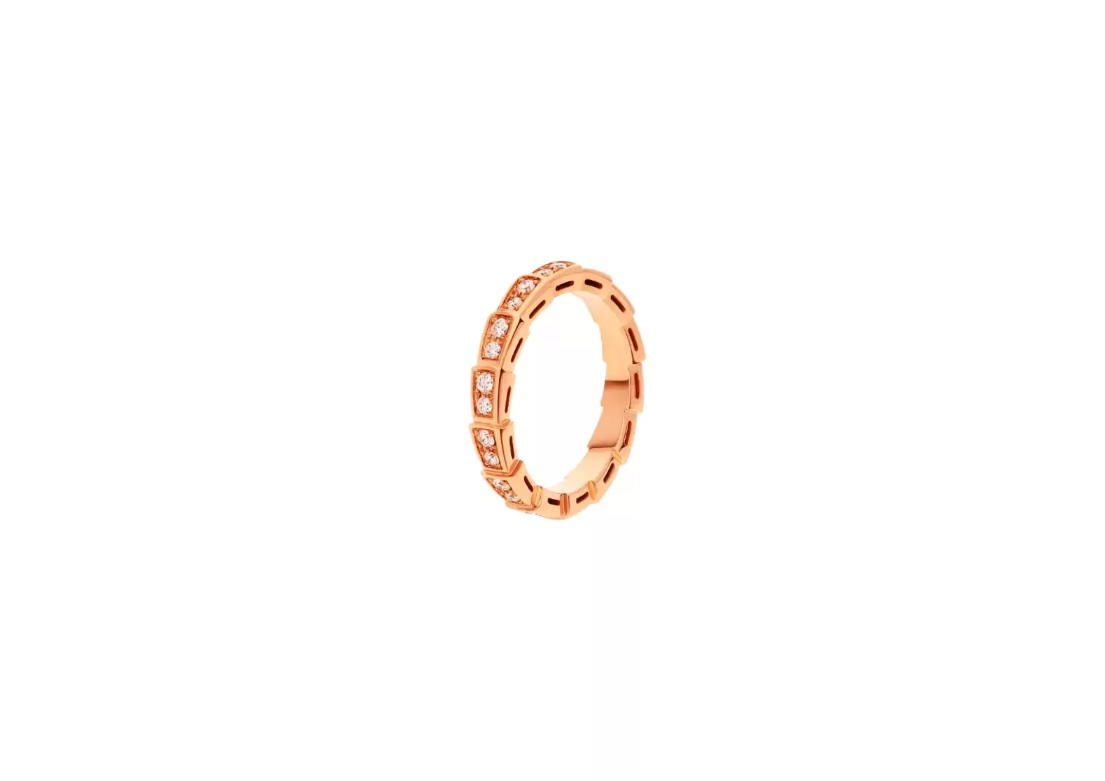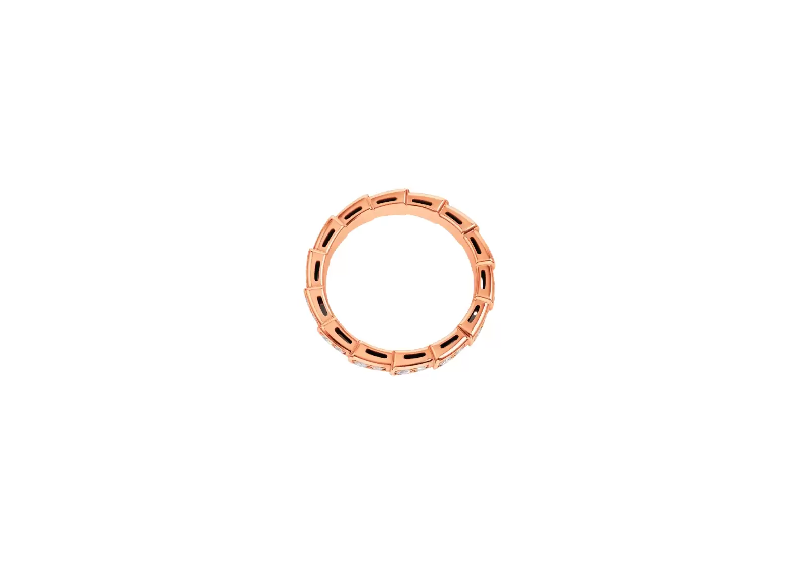 Introducing the Preloved: Serpenti Viper wedding band in 18 kt rose gold, adorned with a breathtaking display of full pavé diamonds. Prepare to be mesmerized as Bulgari pays homage to its spirit animal, capturing the essence of seduction within this exquisite piece.