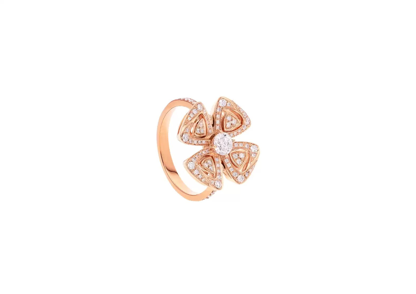 Reimagining the multifaceted beauty of nature, Bvlgari has crafted a precious floral icon that sparkles endlessly. Four rose gold and diamond petals delicately embrace a central diamond, creating a breathtaking symphony of light and beauty. Each diamond is meticulously chosen to ensure unparalleled brilliance and radiance.