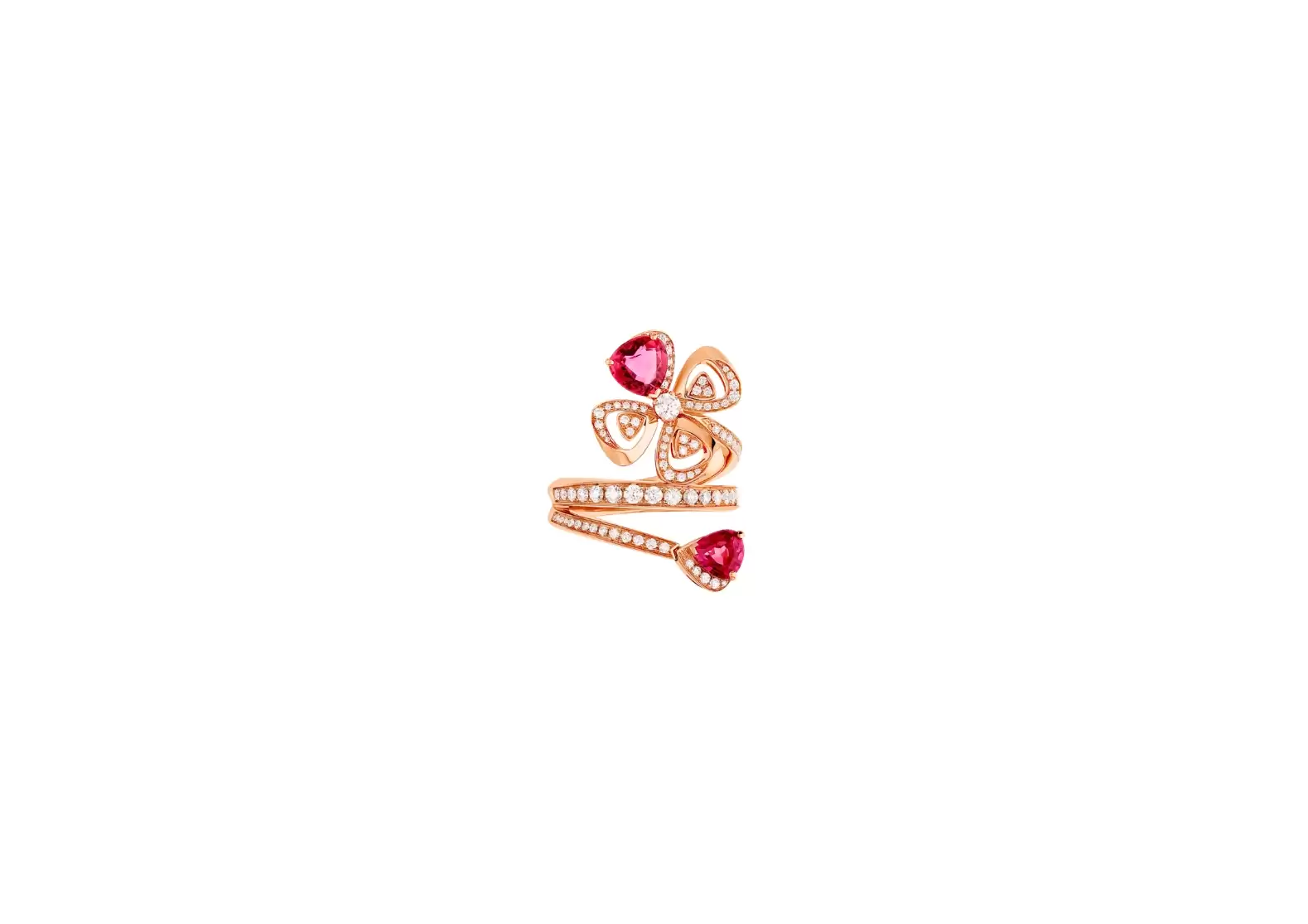 Embellished with the brilliance of precious diamonds, the floral motif comes alive with Bulgari's signature touch of color. Two exquisite rubellite petals create a mesmerizing interplay of volumes, shapes, and reflections, adding a touch of vibrancy to this already magnificent piece.