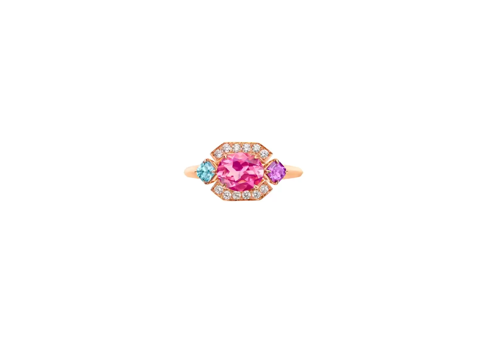 Don't miss out on the opportunity to own a truly remarkable piece of jewelry. Order your Allegra 18 kt rose gold ring with pink tourmaline, amethyst, blue topaz, and pavé diamonds today and let your vibrant personality shine through.