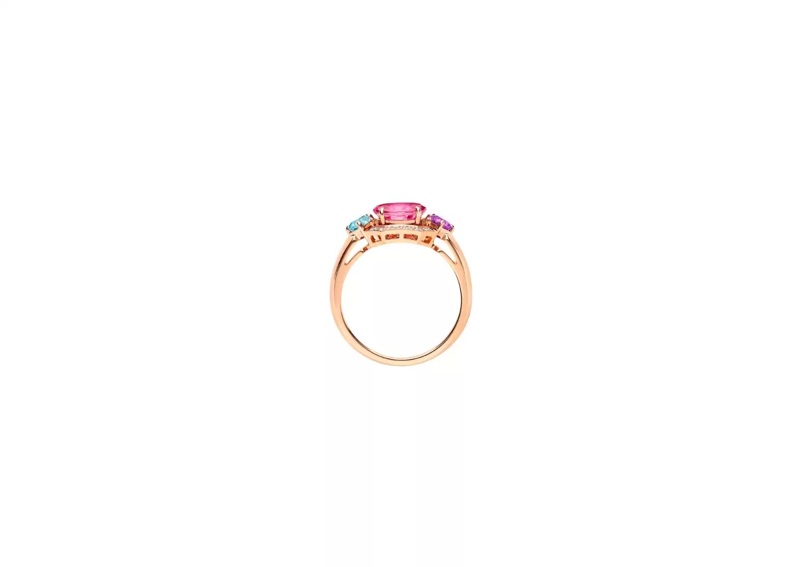 Introducing the exquisite Allegra 18 kt rose gold ring, a true masterpiece that exudes Bulgari's exuberant and bold approach to color. This stunning piece is set with a captivating pink tourmaline, a mesmerizing amethyst, a dazzling blue topaz, and adorned with pavé diamonds.