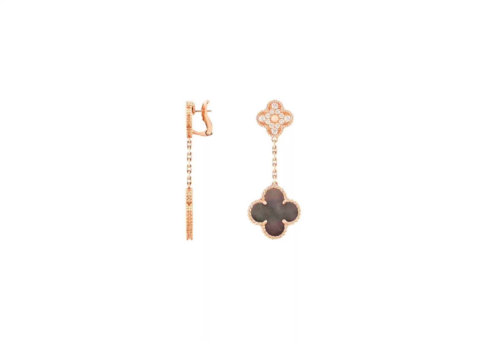 Introducing the exquisite Preloved: Magic Alhambra Earrings by Van Cleef & Arpels. Crafted with utmost precision, these earrings feature 2 motifs made from 18K rose gold, adorned with stunning gray mother-of-pearl and round diamonds.