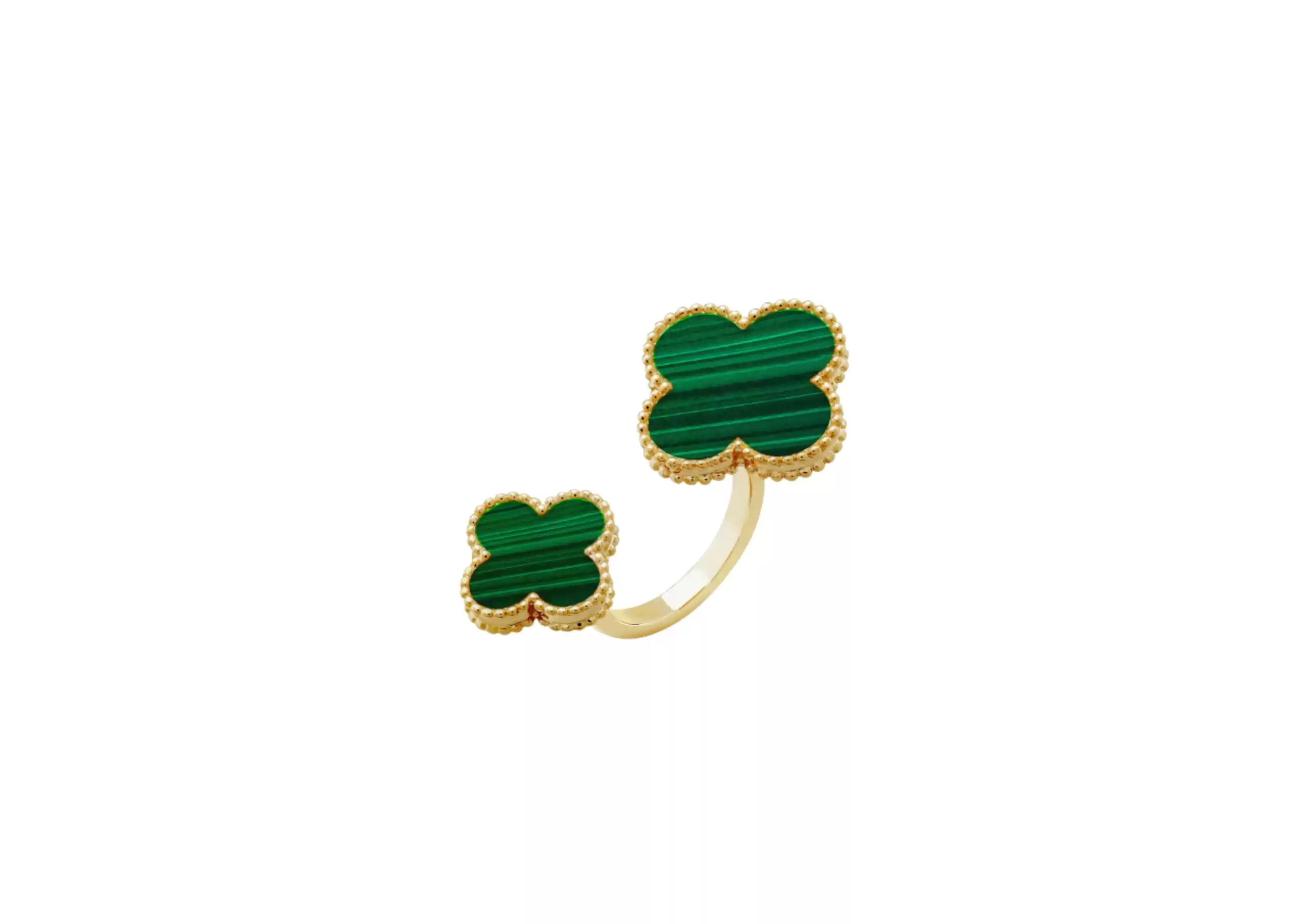 The Magic Alhambra Between the Finger ring features two malachite stones, each showcasing its own unique color and distinctive features. As a result, every creation is truly one-of-a-kind, ensuring that you will own a truly exclusive piece of jewelry.