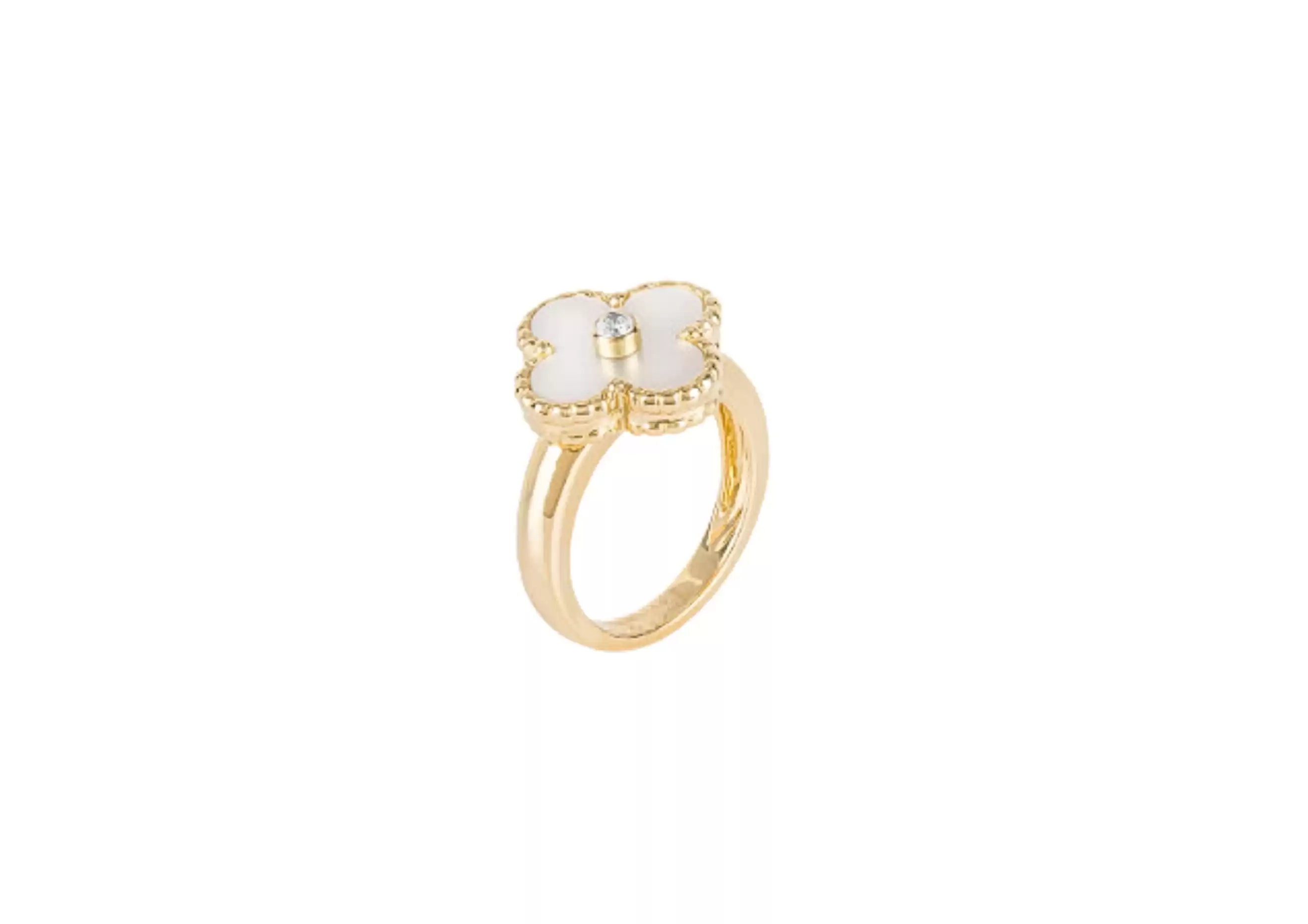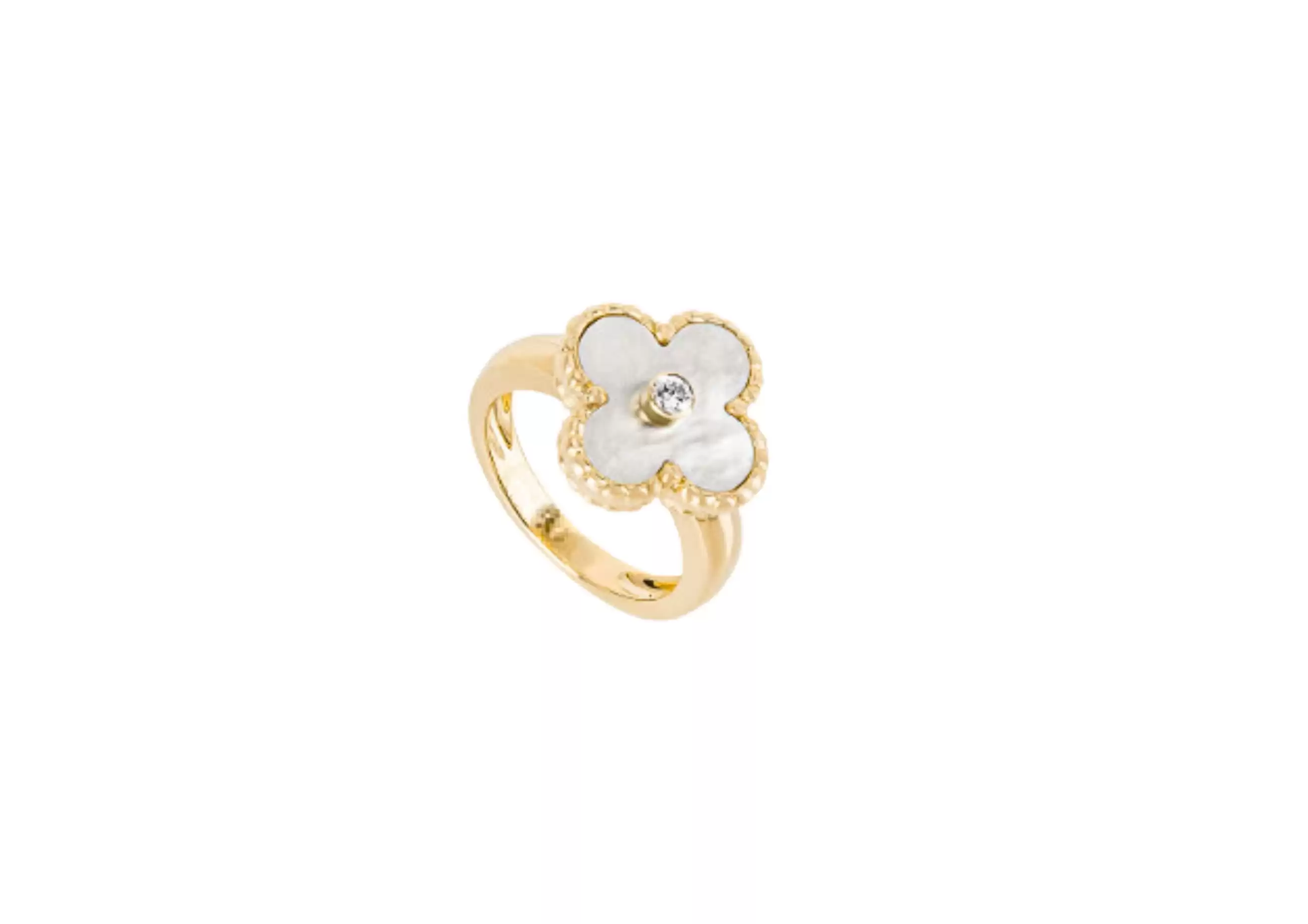 With its timeless design and impeccable craftsmanship, this Vintage Alhambra ring is a true statement piece. The delicate white mother-of-pearl adds a touch of elegance, while the round diamond sparkles with every movement.