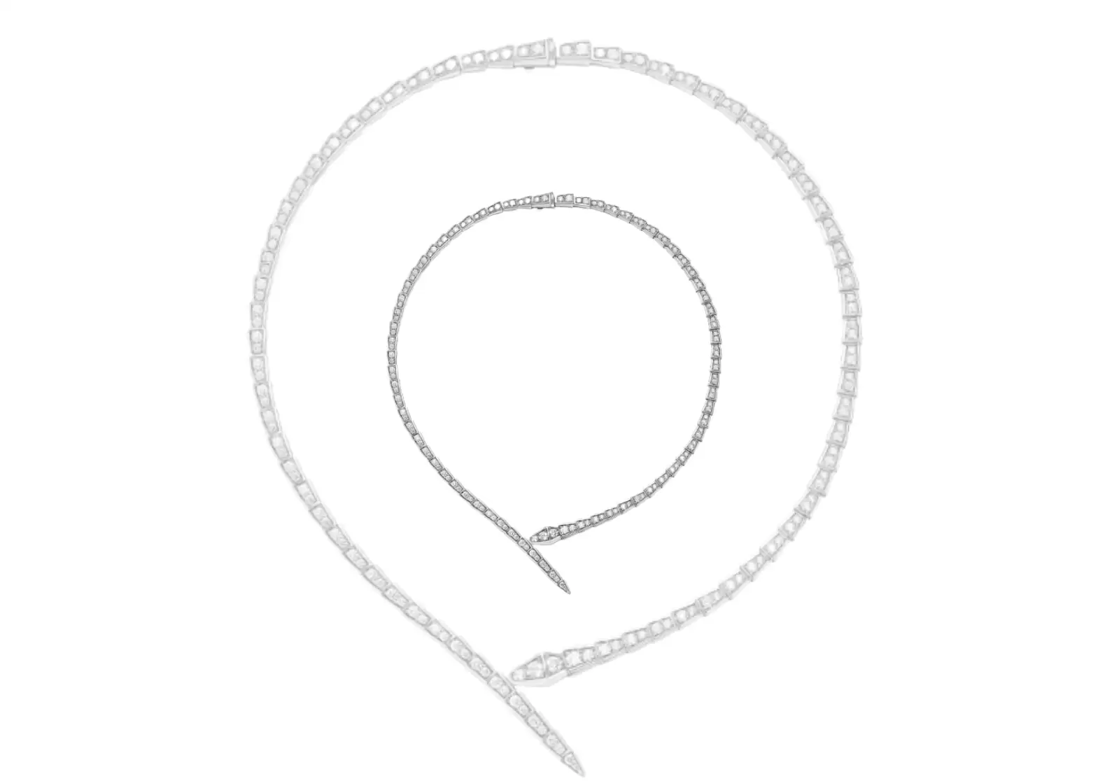 Crafted with meticulous attention to detail, each individual scale of this necklace is delicately adorned with dazzling pavé diamonds. The result? An exquisite piece that exudes elegance, sophistication, and an irresistible blend of geometric flair and refined sinuosity.