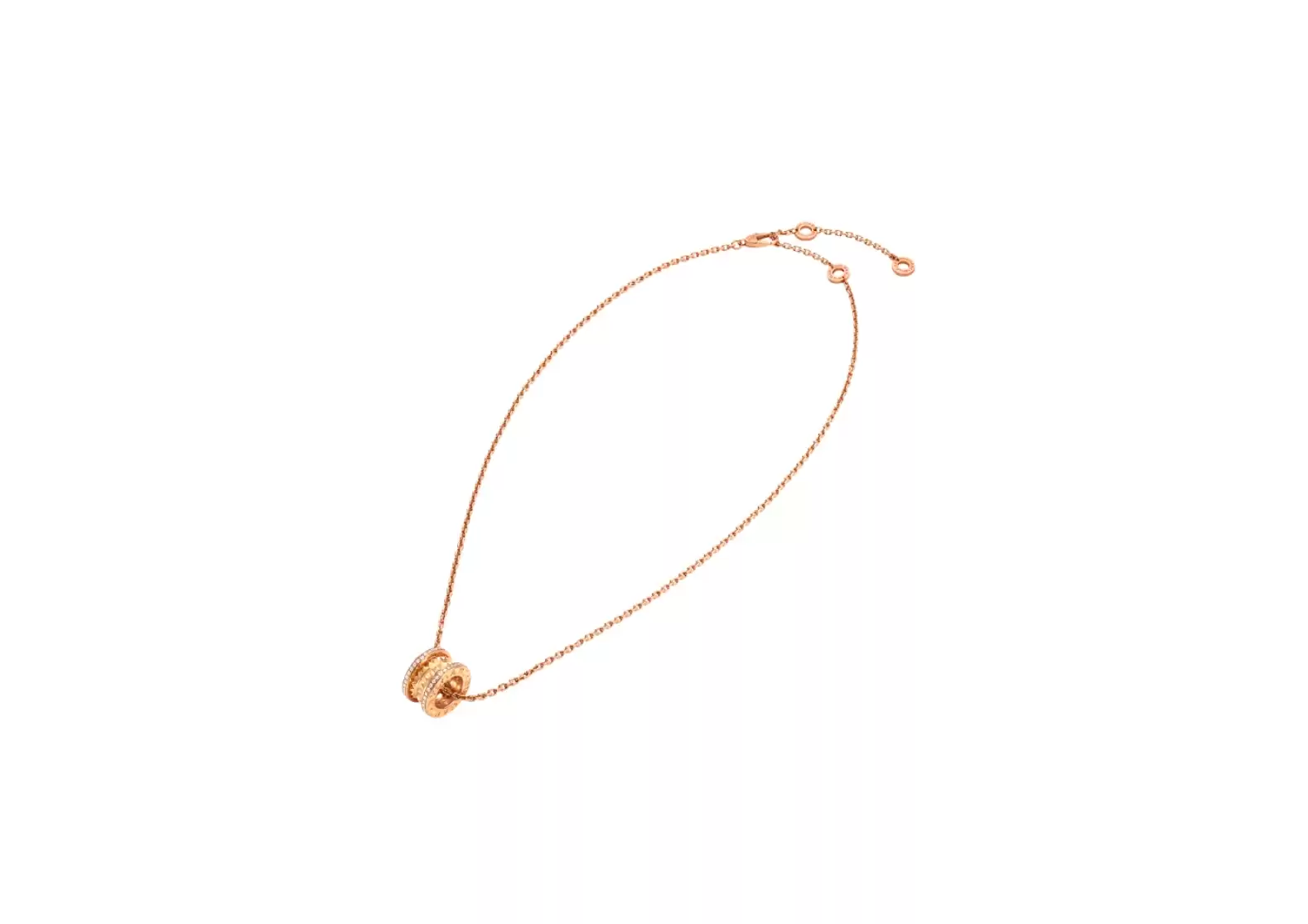Indulge in the allure of the B.zero1 Rock 18kt Rose Gold Pendant Necklace with Studded Spiral Pavé Diamonds on the Edges and 18kt Rose Gold Chain. Embrace your individuality and make a bold statement with this extraordinary piece from Bulgari.