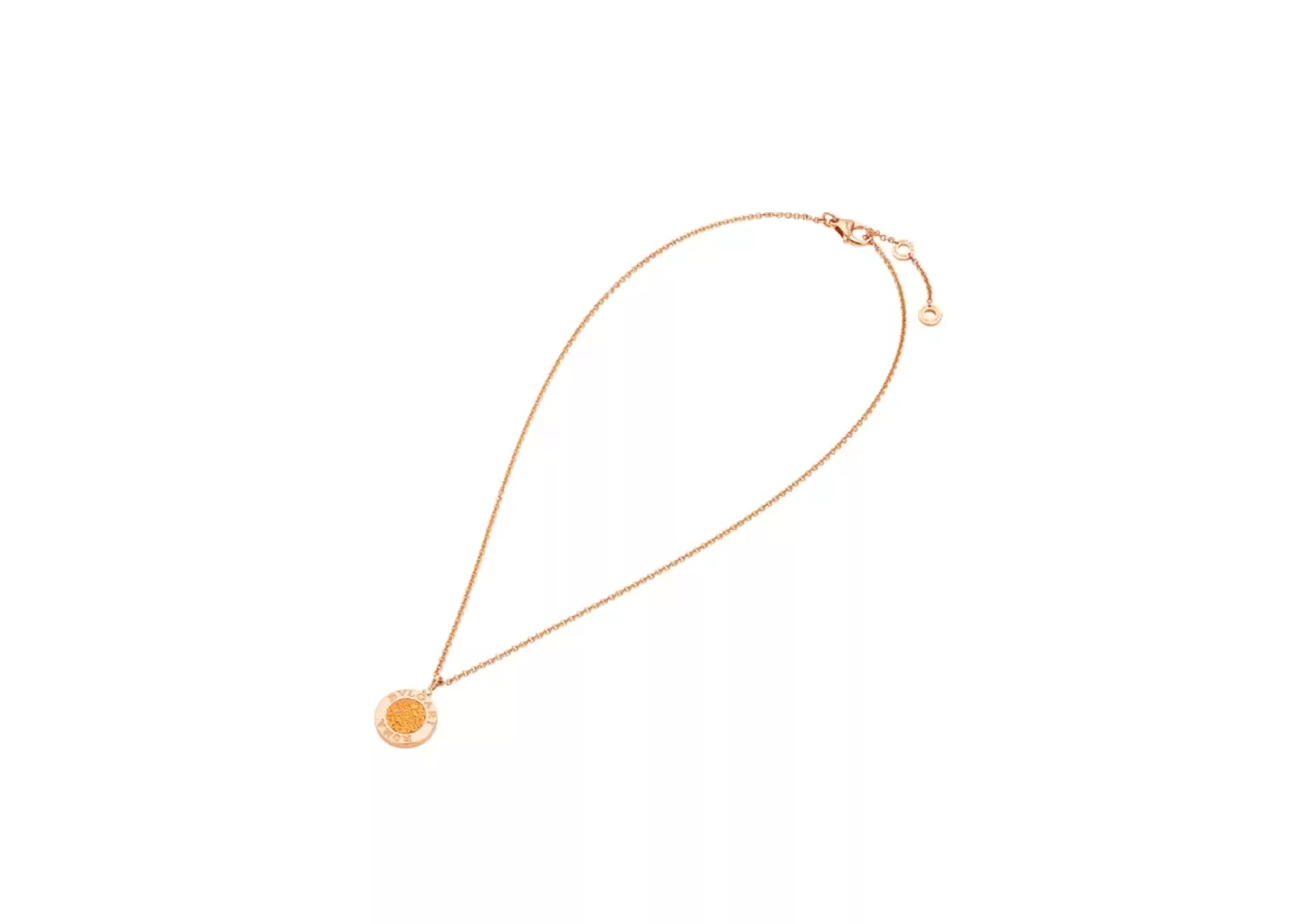 Introducing the breathtaking Bulgari18ktrosegoldnecklacesetwith a mother-of-pearl insert and mandarin garnets on the pendant. This exquisite piece is a true testament to the brand's Roman heritage, seamlessly blending tradition with contemporary elegance.