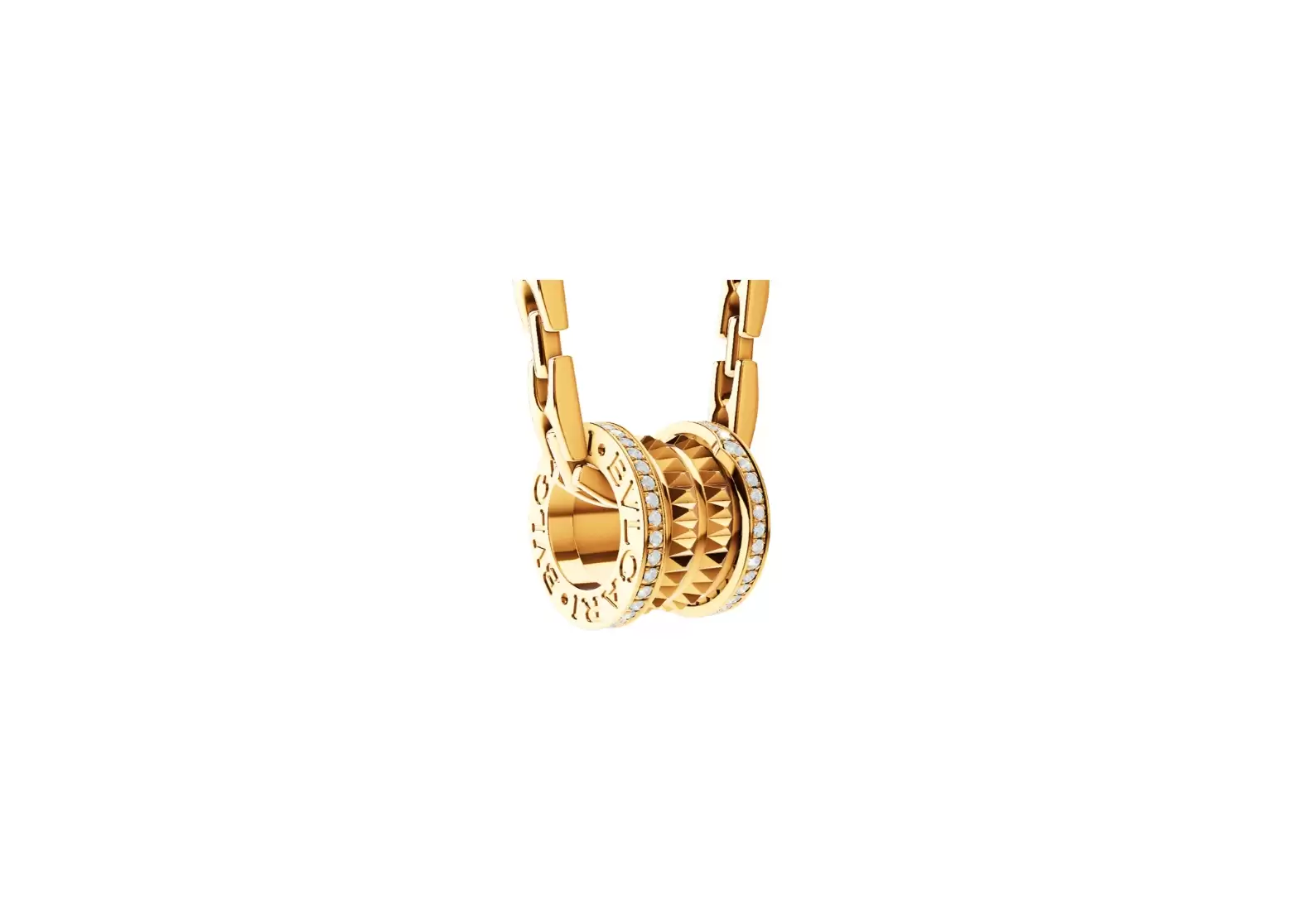 This groundbreaking piece challenges conventional jewellery aesthetics, pushing boundaries and redefining what it means to make a statement. Crafted from luxurious 18 kt yellow gold, the necklace features a unique chain that draws inspiration from the iconic B.zero1 ring silhouette, offering two different length options for versatile styling.