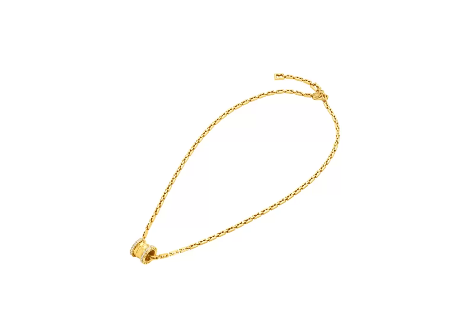 Introducing the Bulgari Zero1 Rock 18 kt yellow gold pendant necklace with studded spiral set with pavé diamonds. Inspired by the magnificent Colosseum, this necklace is a true testament to Bulgari's unrivaled creativity and audacious flair.