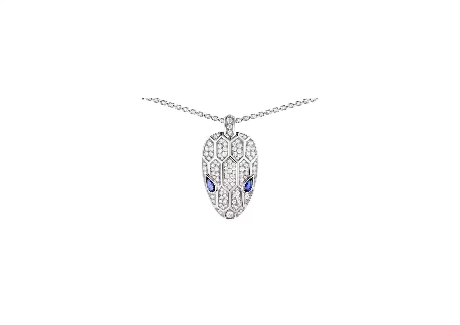 Introducing the breathtaking Serpentine Necklace in 18kt white gold, adorned with mesmerizing blue sapphire eyes and a chain and pendant lavishly paved with diamonds. Prepare to be enchanted as this exquisite piece captures the essence of allure and elegance.