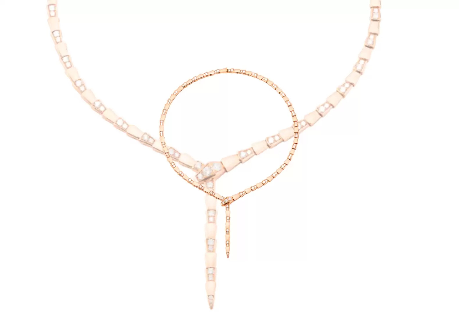 Radiating sophistication and glamour, the Serpenti Viper necklace elegantly wraps around the neck, showcasing the exquisite beauty of scales and the snake's unmistakable sinuosity. Crafted with meticulous attention to detail, the 18 kt rose gold shimmers with a warm and luxurious glow, while the demi-pavé diamonds add a touch of celestial sparkle.