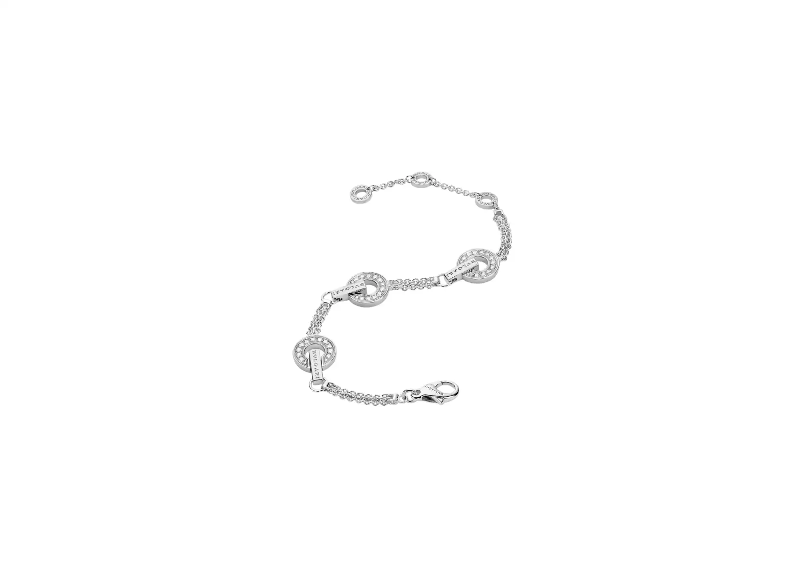 Introducing the breathtaking Bvlgari Openwork 18 kt white gold bracelet, a true masterpiece that embodies the essence of BVLGARI's rich Roman heritage and its seamless blend with modern elegance. Prepare to be captivated by the sheer brilliance of this exquisite piece, adorned with a mesmerizing display of full pavé diamonds on its circular elements.