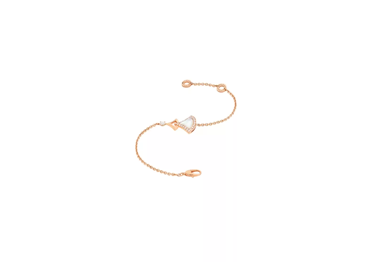 Indulge in the timeless beauty and undeniable sophistication of the DIVAS' DREAM bracelet. Its 18 kt rose gold setting exudes a warm and radiant glow, perfectly complementing the iridescent allure of the mother-of-pearl and the brilliance of the pavé diamonds.