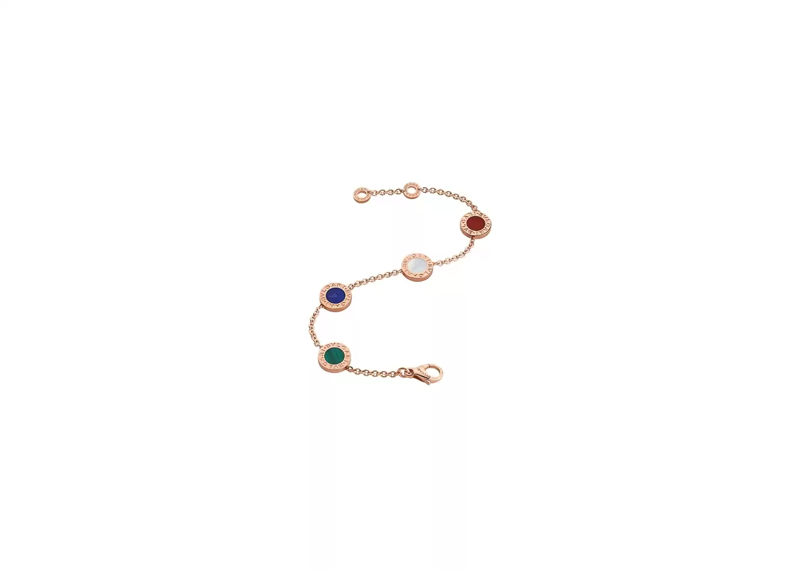 Introducing the exquisite BVLGARI 18 kt rose gold bracelet set with carnelian, lapis, malachite, and mother of pearl elements. This stunning piece transcends time, blending the rich heritage of Rome with a touch of modernity, resulting in a truly captivating fusion of culture and elegance.