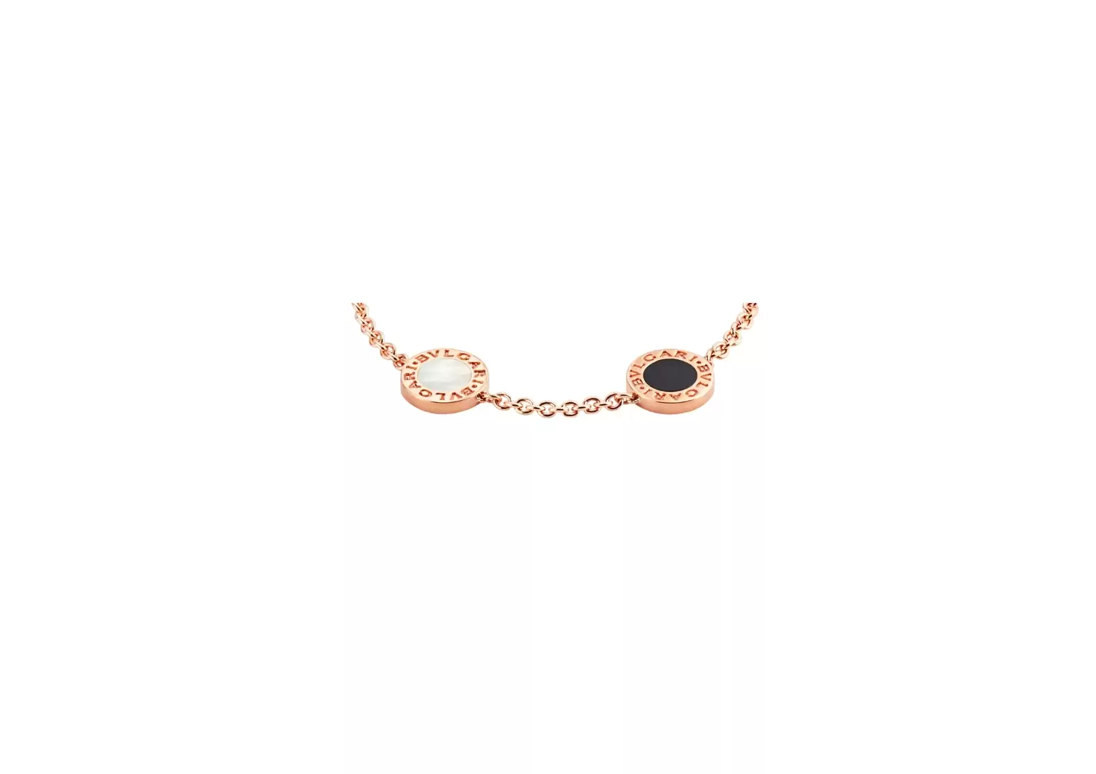 Introducing the Bvlgari Bvlgari bracelet, a true embodiment of sophistication and style. Crafted with utmost precision in 18 kt rose gold, this exquisite piece is adorned with captivating mother-of-pearl and onyx elements.