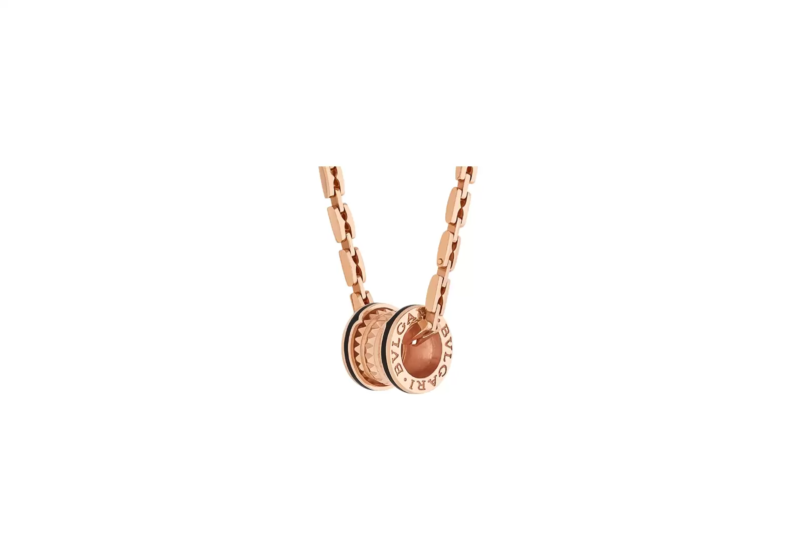 Introducing the B.zero1 Rock 18 kt rose gold pendant necklace with studded spiral and black ceramic inserts. This extraordinary piece draws its inspiration from the majestic Colosseum, the world's most renowned amphitheatre. Bulgari's creative vision shines through in this groundbreaking design, infused with a touch of irreverence.