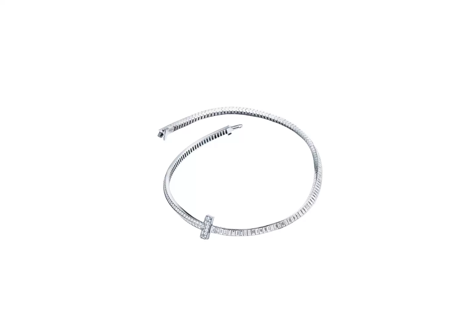 Adorned with striking baguette diamonds, this necklace is a reinvention of a Tiffany icon. The Tiffany T1 designs are not just mere accessories, but they represent individual strength and perpetual power. Wearing this necklace outwardly expresses the inner qualities that make you unique and extraordinary.