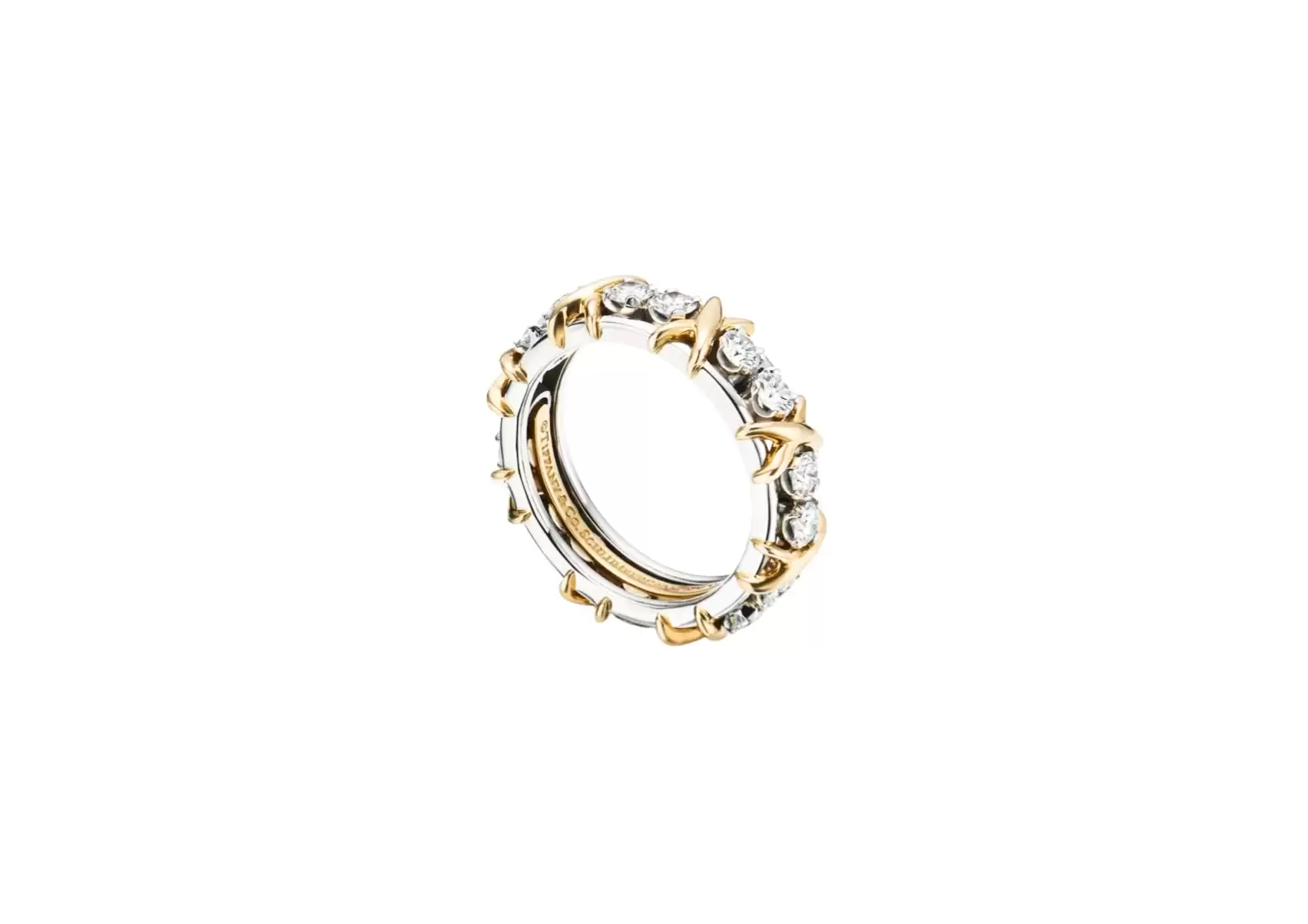 Introducing the exquisite Preloved: Tiffany & Co. Schlumberger® Sixteen Stone Ring I 60099365, a true testament to the visionary artistry of Jean Schlumberger. Renowned for his intricate designs, this ring showcases a mesmerizing combination of brilliant diamonds and golden X's, resulting in a dazzling masterpiece.