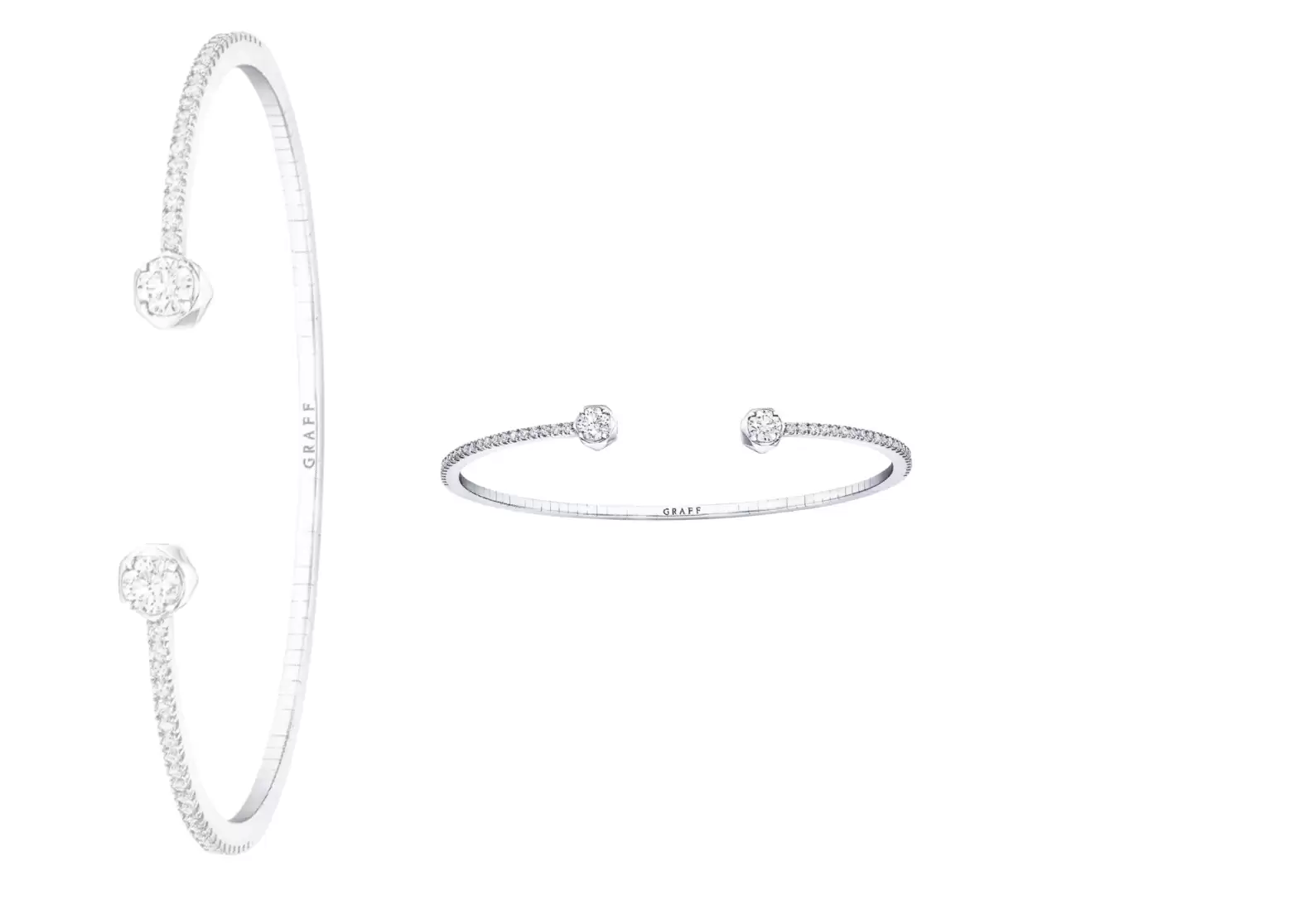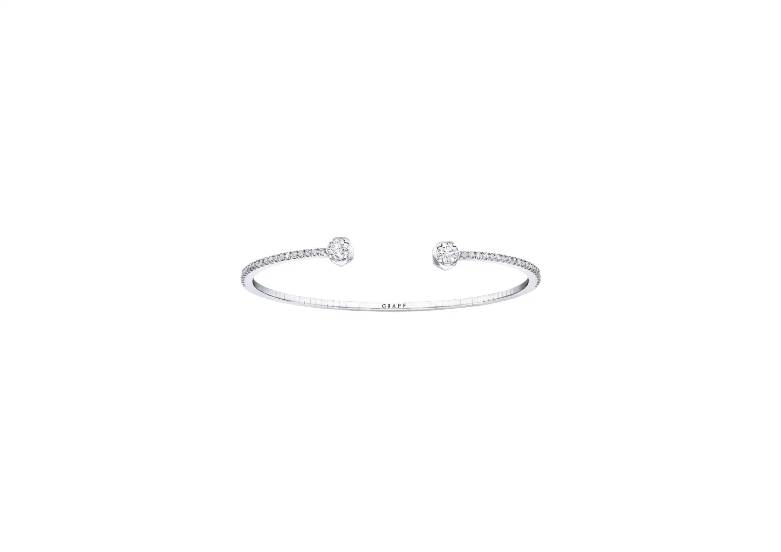 What sets this bangle apart is the sleek stream of diamonds that unites the solitaires, creating a mesmerizing visual display. The faceted setting itself is a striking interpretation of the facets of a diamond, paying homage to the very stone that has become synonymous with the House of Graff.