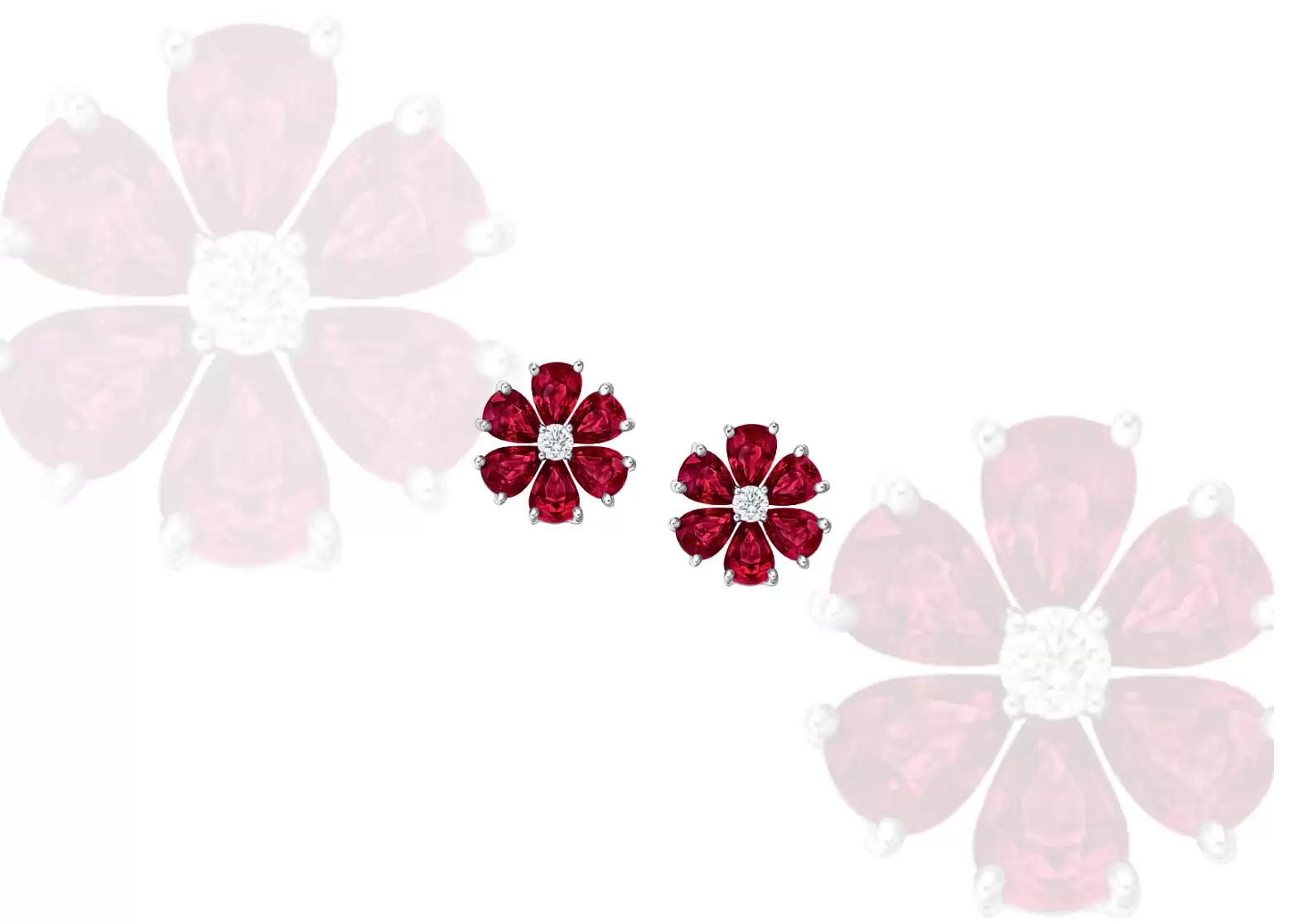 Introducing the Preloved: Forget-Me-Not Ruby and Diamond Earrings (Product Reference: EARP1MFLRFMN). Immerse yourself in the allure of nature with these breathtaking earrings that beautifully capture the essence of two charming forget-me-not flowers.