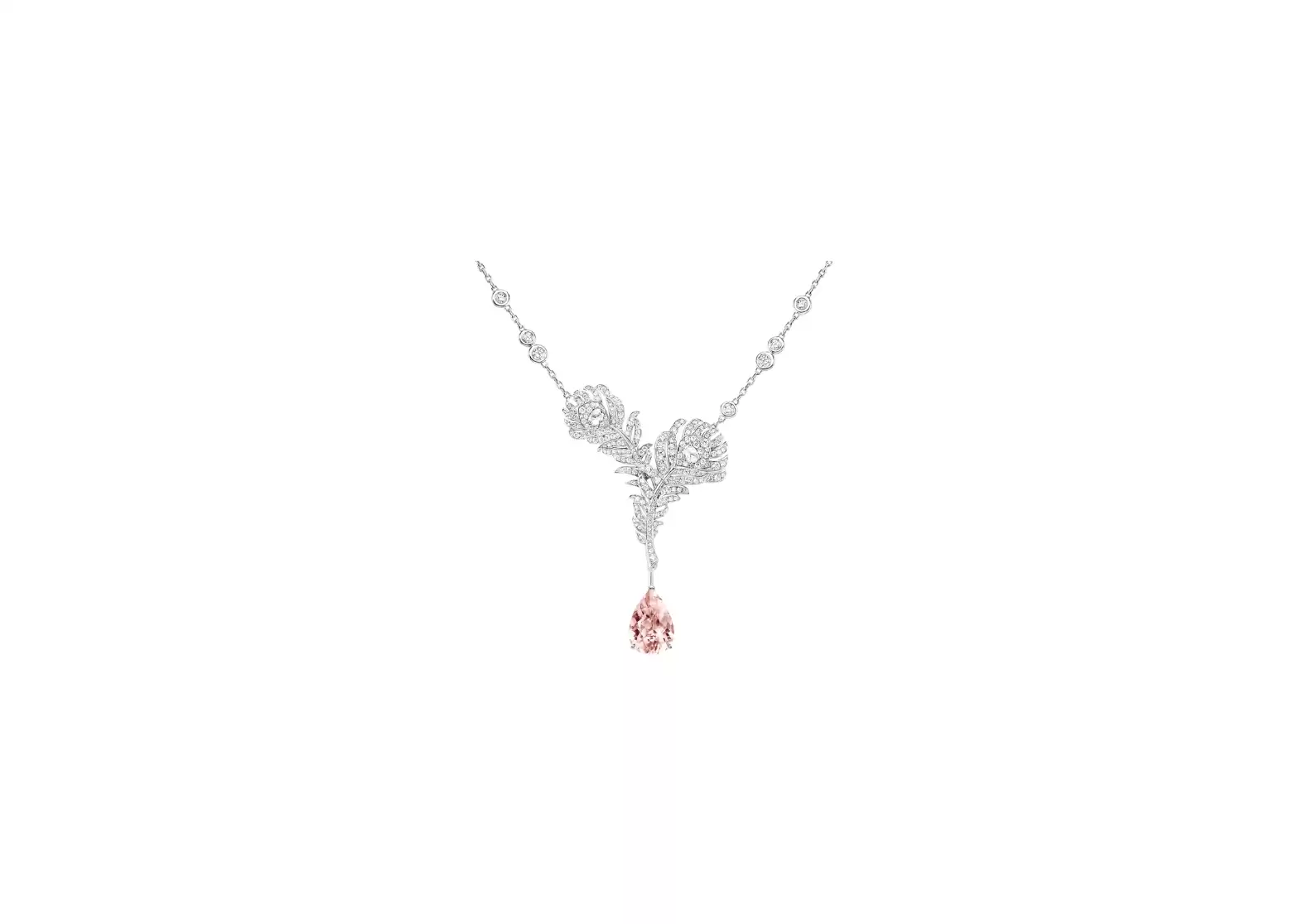 Introducing the exquisite Preloved: Plume De Paon Pendant REF ◌ JCL01129, a true masterpiece crafted with the finest materials. This stunning pendant showcases a captivating pear-shaped morganite, weighing a minimum of 5.00 carats, radiating a subtle blush hue that exudes elegance.
