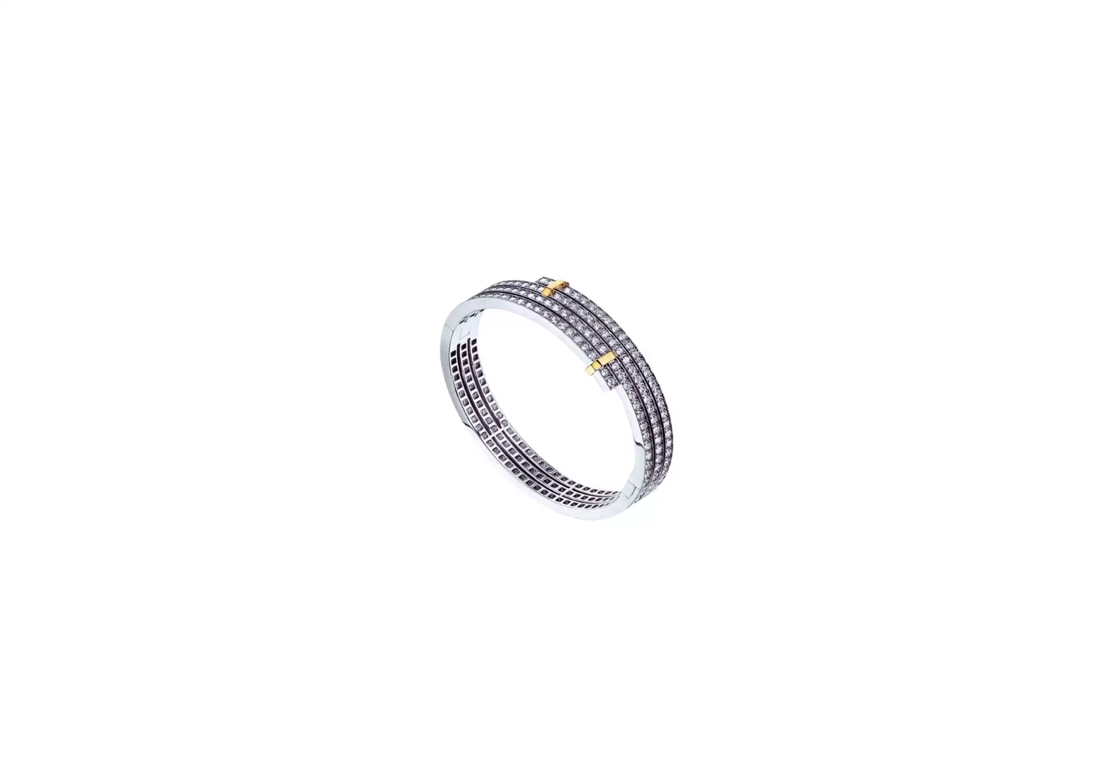 The Tiffany Edge collection showcases a distinctive 18k yellow gold accent that seamlessly connects multiple rows of round brilliant diamonds. The result is a breathtaking balance between sleek lines and dazzling diamonds, making this bracelet a true showstopper.