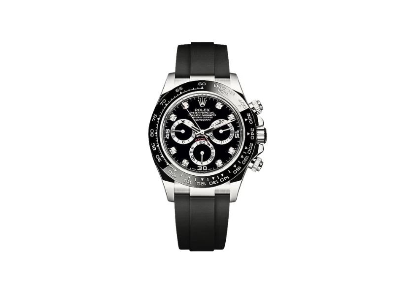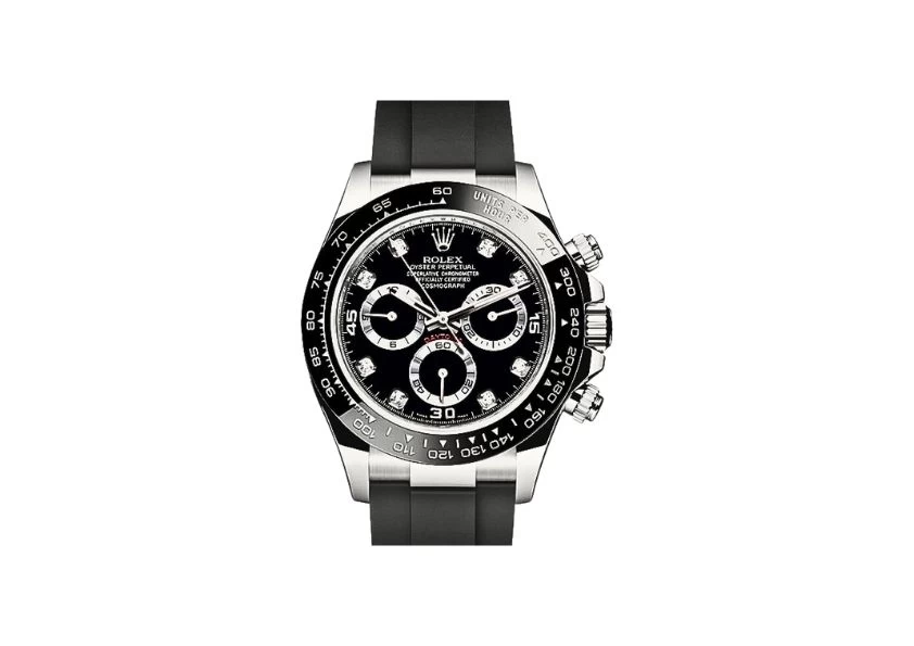 DescriptionIntroducing the Rolex Cosmograph Daytona Black Diamond Dial Men's Watch 116519LN-0025, a true masterpiece of luxury and precision. This exquisite timepiece combines timeless elegance with cutting-edge technology, making it a must-have for any watch enthusiast. Crafted with meticulous attention to detail, this Rolex Oyster Perpetual Cosmograph Daytona features a stunning black dial adorned with diamond hour markers. The black monobloc Cerachrom ceramic bezel, with its moulded tachymeter scale, adds a touch of sophistication and functionality. Equipped with a chronograph feature, this watch boasts a large central chronograph second hand, a 30-minute counter sub-dial at 3 o'clock, and a 12-hour counter sub-dial at 9 o'clock. The small seconds sub-dial at 6 o'clock and the stop-seconds function ensure precise timekeeping. Powered by a self-winding automatic movement, the Rolex Caliber 4130, this watch is COSC Superlative Chronometer certified, guaranteeing exceptional accuracy and reliability. With a 72-hour power reserve, you can trust that this timepiece will keep ticking even during extended periods of non-use. The polished and brushed solid 18k white gold case exudes luxury and sophistication, while the black Oysterflex bracelet offers both comfort and durability. Its internal flexible metal blades, combined with high-performance elastomer, provide a secure and comfortable fit. Designed for adventure, this watch is waterproof up to 100 meters (330 feet), allowing you to explore both land and sea without worry. The scratch-resistant sapphire crystal ensures a clear and unobstructed view of the dial, while the Chromalight blue luminescent hands ensure optimal visibility even in low-light conditions. This Rolex Cosmograph Daytona comes with a 6-year warranty, guaranteeing its authenticity and quality. It also includes a certificate of authenticity, manufacturer box, and manual, making it the perfect gift for yourself or a loved one. Experience the pinnacle of luxury and precision with the Rolex Cosmograph Daytona Black Diamond Dial Men's Watch 116519LN-0025. Elevate your style and make a statement with this iconic timepiece. |