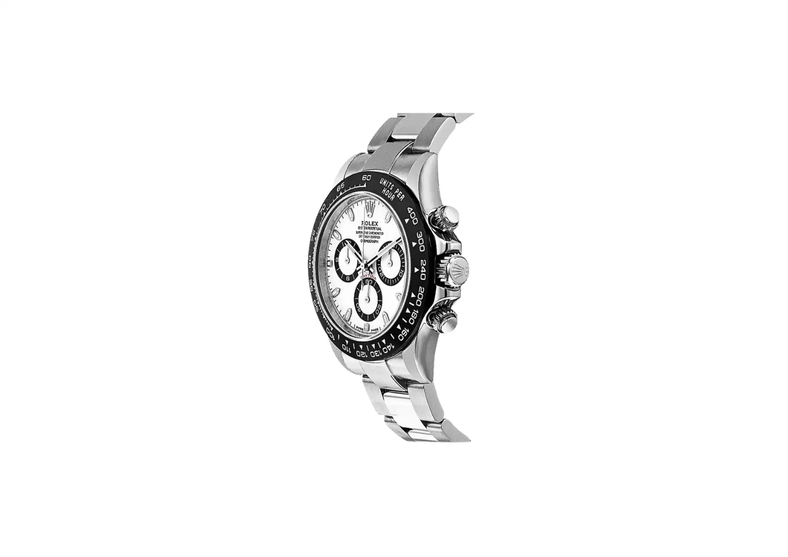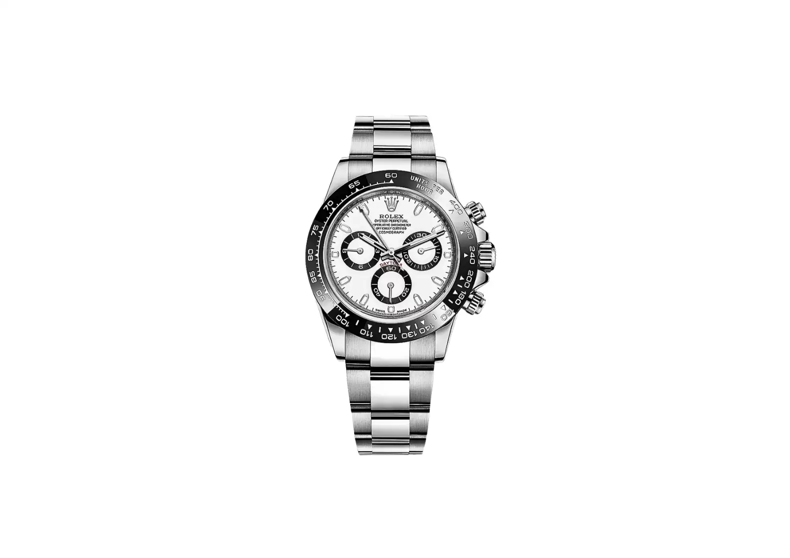The black monobloc Cerachrom ceramic bezel adds a touch of elegance and durability to the watch. Engraved with a tachymetric scale, it allows for precise measurements of speed.