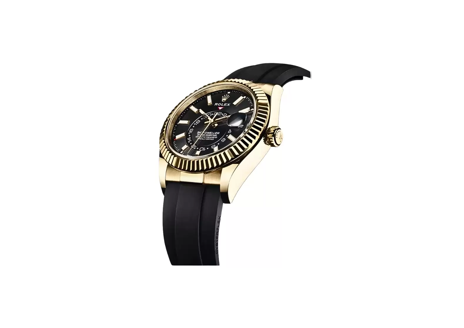 The folding Oysterclasp with Rolex Glidelock extension system ensures a secure and comfortable fit on wrists ranging from 6.75" to 7.5". Also known as model # M326238-0009 / 326238-BLACK, this Rolex Sky-Dweller Men's Luxury Watch is a true masterpiece that combines style, functionality, and prestige.