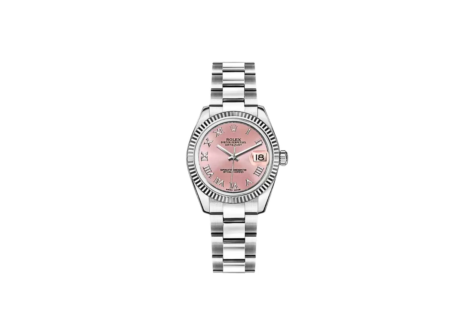 Crafted with precision and attention to detail, this Swiss-made watch features a stunning pink dial adorned with Roman numeral hour markers, adding a touch of classic charm. The polished solid 18k white gold fluted bezel enhances the overall aesthetic, making it a true statement piece.