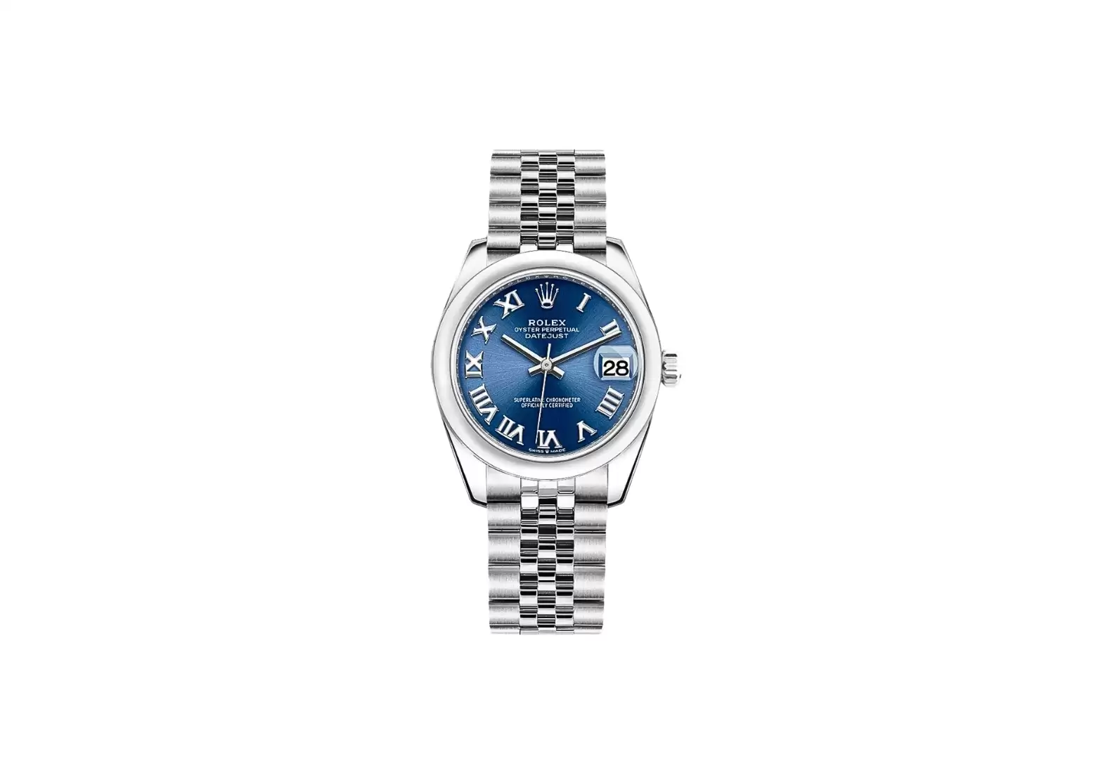 Crafted with precision and attention to detail, this Swiss Made watch features a stunning blue dial adorned with Roman numeral hour markers. The polished 904L Oystersteel stainless steel domed bezel adds a touch of sophistication to the overall design.