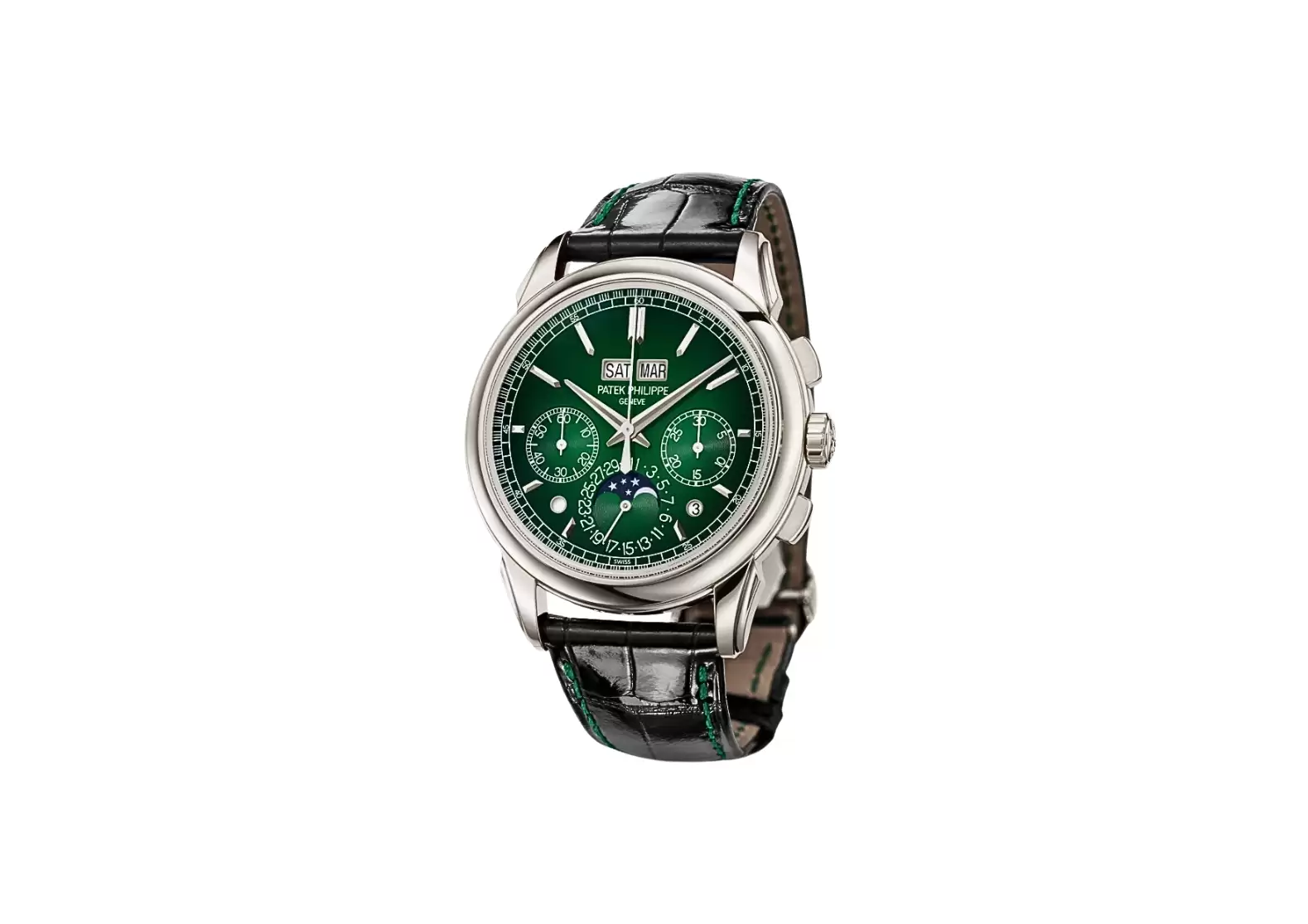 The dial of the Patek Philippe 5270P-014 is a stunning lacquered green with a black-gradient rim, adorned with gold applied hour markers. This combination creates a visually striking and sophisticated look.