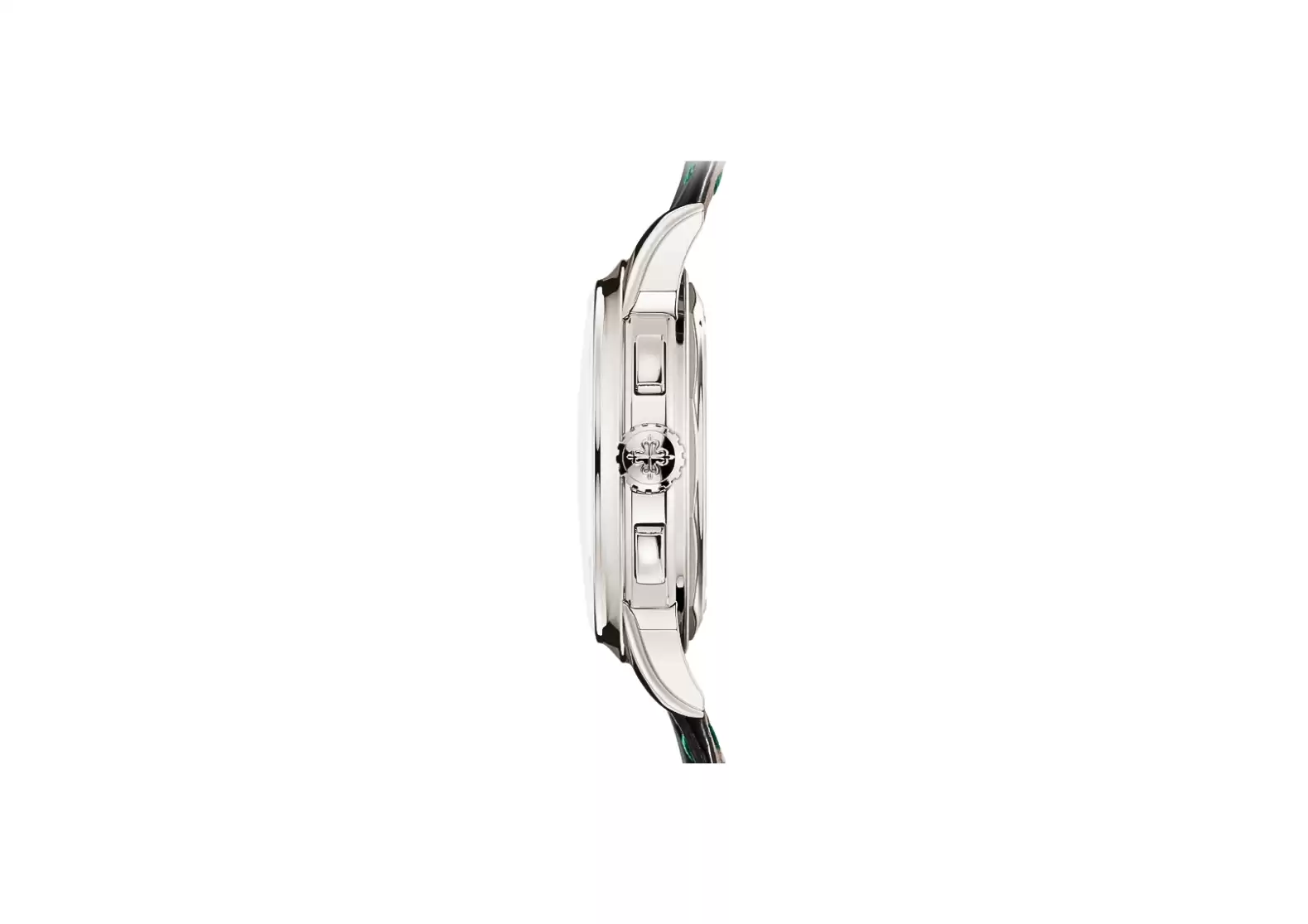 The perpetual calendar displays are thoughtfully arranged, with a date hand and moon phase indicator at 6 o'clock. At 12 o'clock, you'll find a twin day/month aperture, accompanied by round apertures for the day/night indication and leap-year cycle. This timepiece is powered by the Caliber CH 29-535 PS Q, a manually wound mechanical movement that boasts a traditional architecture and an exceptionally thin calendar mechanism. Additionally, it features six patented innovations related to the chronograph function.