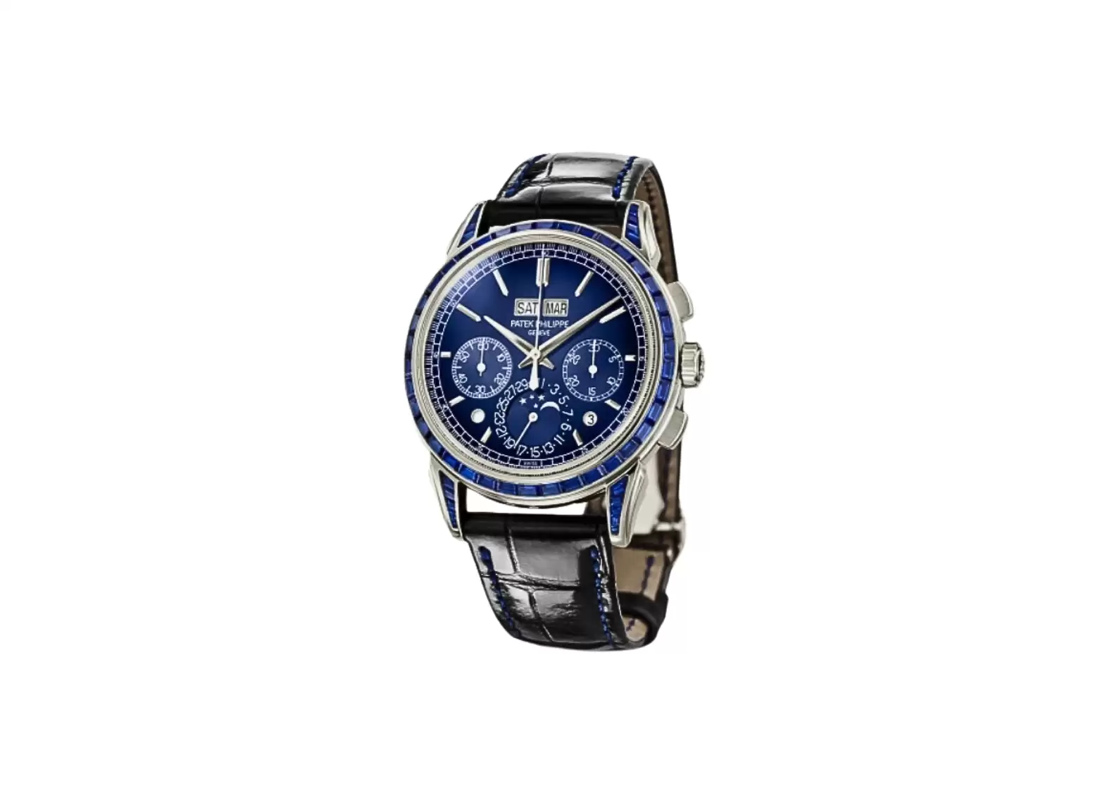 Introducing the exquisite Pre-owned Patek Philippe 5271/11P-010, a stunning timepiece that pays homage to the iconic Grande Complication. This jewelry version of the chronograph with perpetual calendar Reference 5271 is truly a masterpiece, adorned with 80 mesmerizing blue baguette-cut sapphires weighing 5.16 carats.