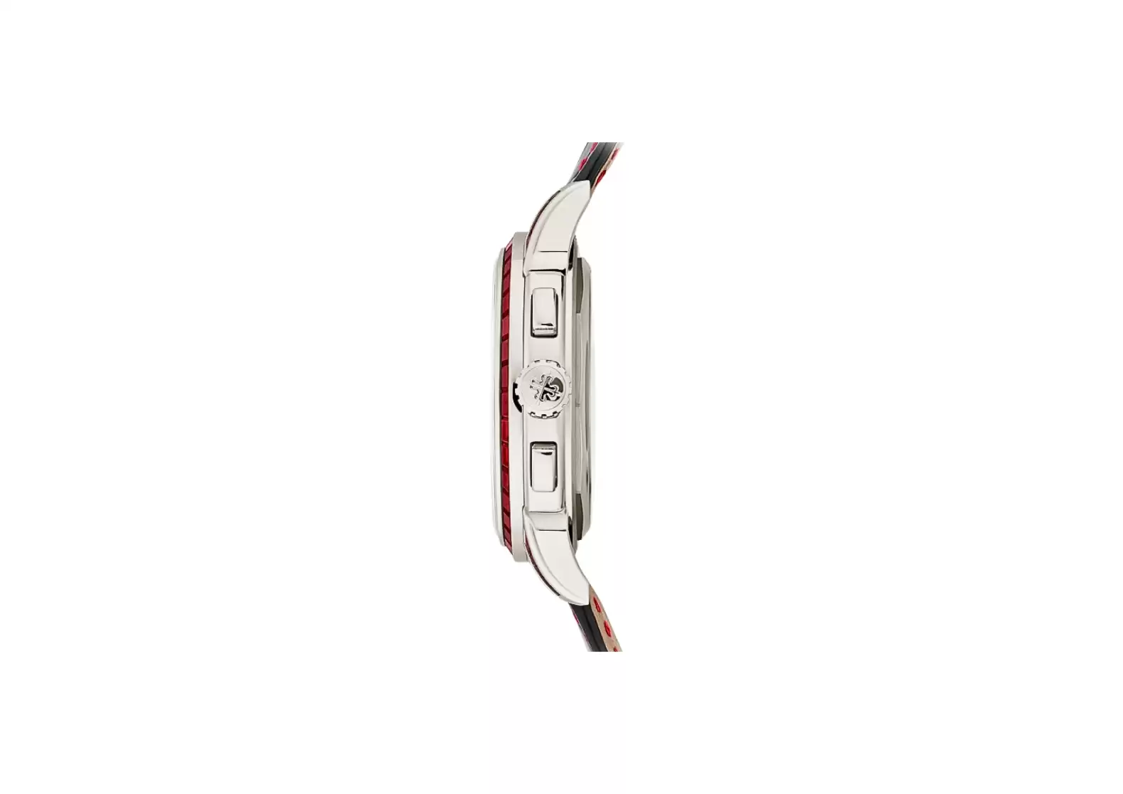 Completing the ensemble is the alligator leather strap, hand-stitched with square scales, in a shiny black finish. The fold-over clasp, set with rubies, ensures a secure and comfortable fit on the wrist.