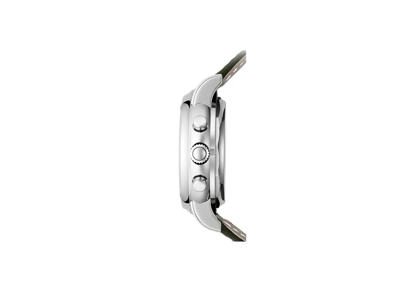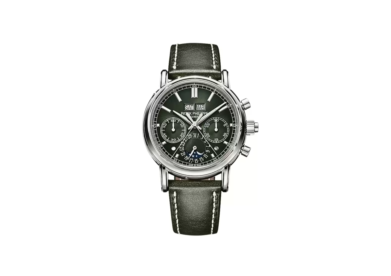 Completing the look is a calfskin strap in a shiny olive green shade, hand-stitched for added quality. The fold-over clasp ensures a secure and comfortable fit.