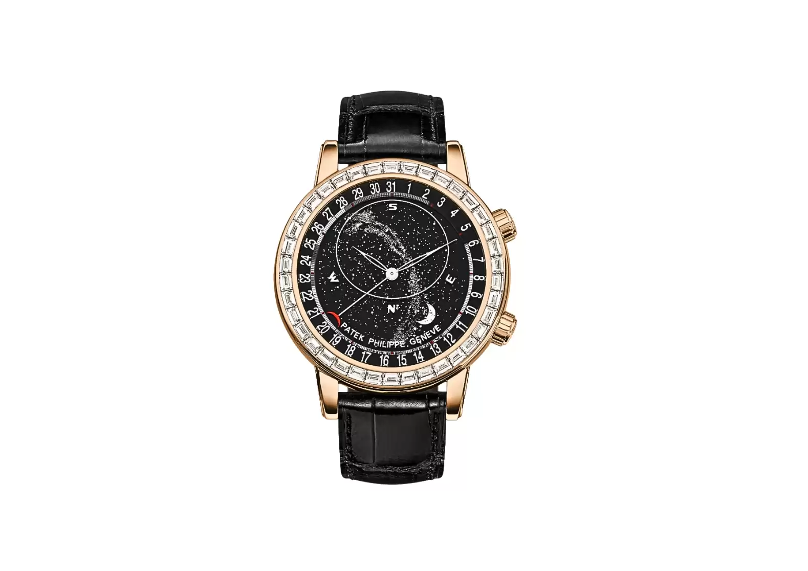The dial of the Pre-owned Patek Philippe 6104R-001 is crafted from transparent sapphire crystal, allowing for a clear view of the sky chart and the magnificent Milky Way. The sky background and moon phases are presented on black sapphire-crystal disks, adding a touch of sophistication to the overall design.