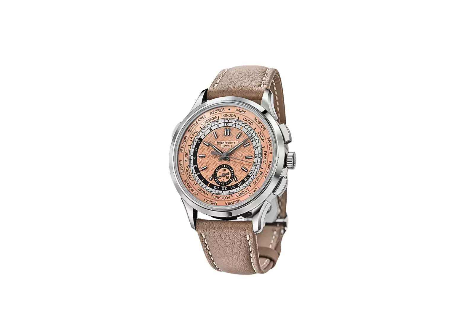 One of the standout features of this watch is its World Time function, which allows you to simultaneously view the time in 24 different time zones. This exclusive patented mechanism can easily correct all displays with just a single pusher located at 10 o'clock.