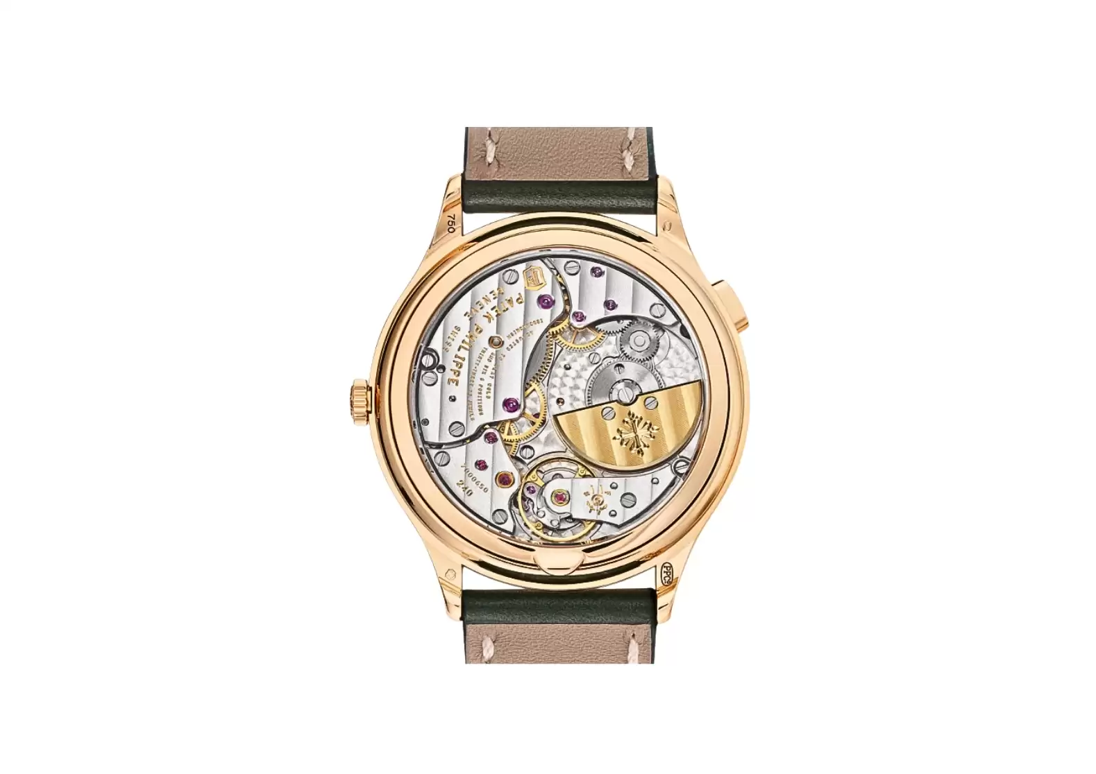 The dial of this remarkable watch showcases the exceptional Rare Craftsmanship skills of Patek Philippe, featuring a finely hand-guilloched basketweave motif at its center. The captivating olive green shade is also reflected on the city disk, where the white-printed names of the cities stand out in an incredibly legible manner.