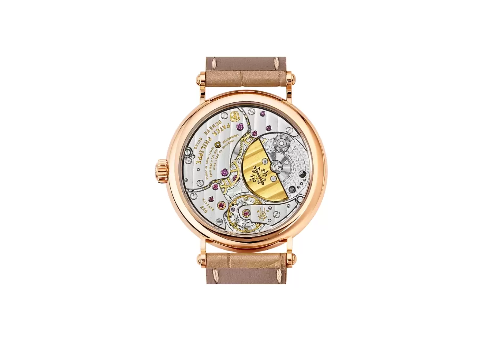 Encased in rose gold, the watch exudes a sense of opulence. The sapphire crystal case back not only showcases the intricate inner workings of the timepiece but also ensures water resistance up to 30 meters. With a diameter of 34.6 mm and a height of 7.37 mm, this watch offers a perfect balance between size and comfort.