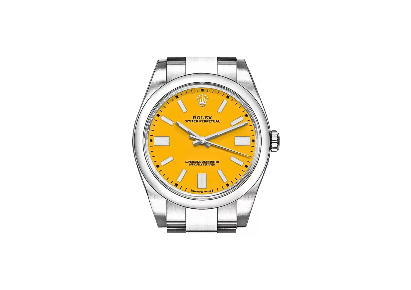 Introducing the Pre-owned Rolex Oyster Perpetual 41 Yellow Dial Oystersteel Men's Watch 124300-0004. This exquisite timepiece boasts a stunning yellow dial with index hour markers, creating a striking and sophisticated look. Crafted with precision and attention to detail, this watch is Swiss made and comes with manufacturer serial numbers, guaranteeing its authenticity.
