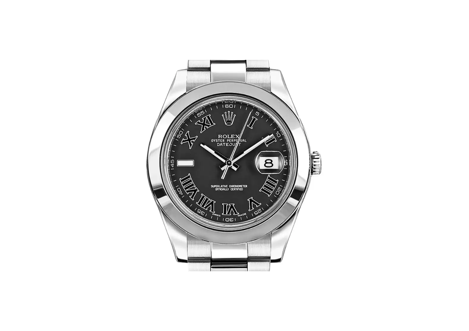 Crafted with meticulous attention to detail, this Swiss Made watch boasts a charcoal dark grey dial adorned with black Roman numeral hour markers, adding a touch of elegance to its overall design. The polished stainless steel smooth bezel further enhances its sleek and refined appearance.