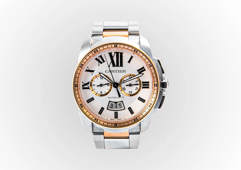 DescriptionThe Cartier Calibre de Cartier Chronograph 42mm is in excellent pre-owned condition. It has a 9-link steel and rose gold band, a silver dial, a rose gold bezel, and a steel case. Mechanized automatic movement, Cartier calibre 1904-CH. |